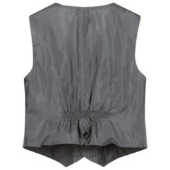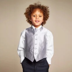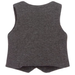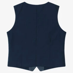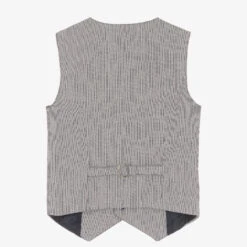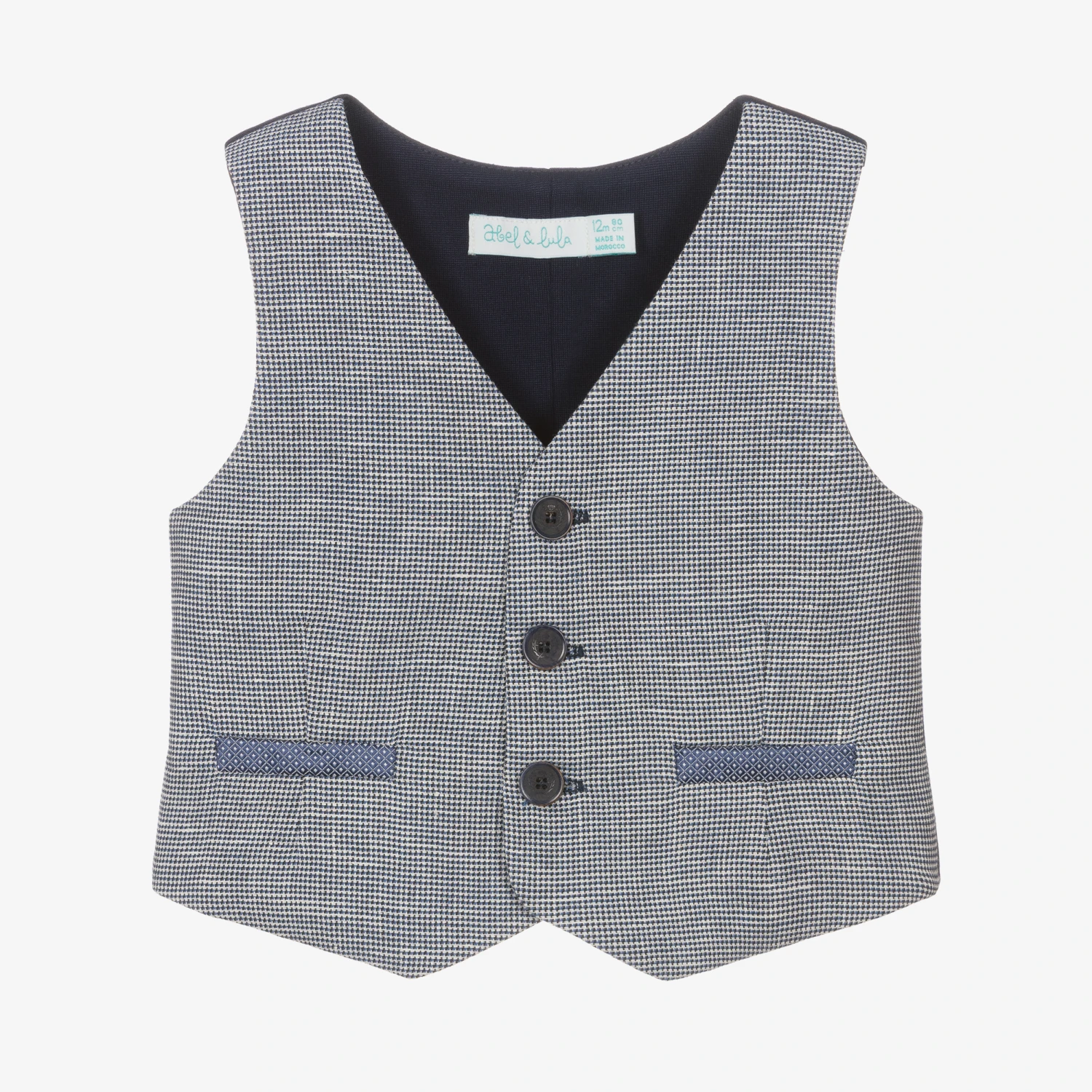 A smart navy blue waistcoat for little boys by Spanish brand Abel & Lula, made in a soft viscose, cotton and linen blend. The front panel is designed in a fine blue, black and white pattern with button fastenings on the front. It is made with a soft jersey back for comfortable wear.