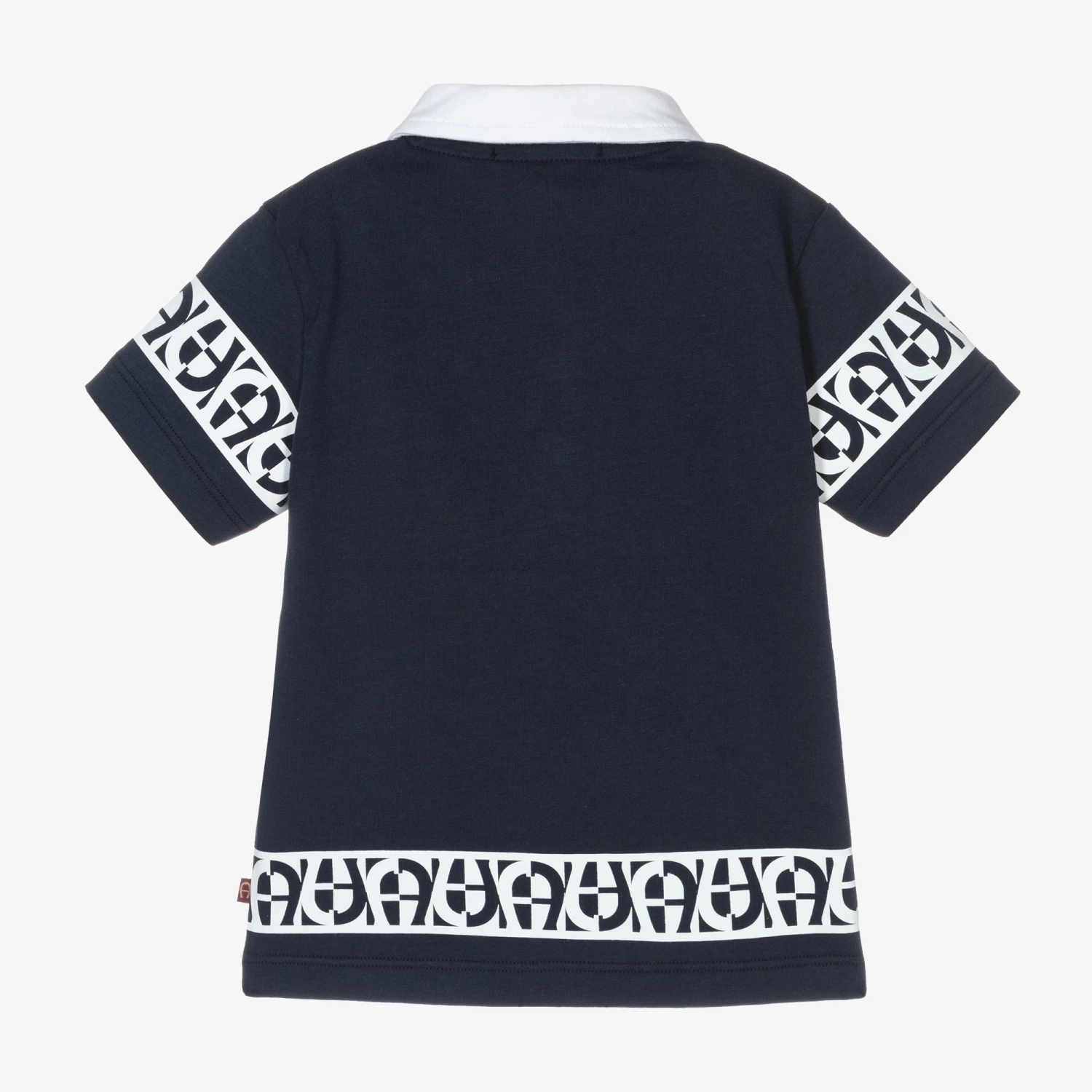 Navy blue polo shirt for little boys by AIGNER, made in soft and stretchy cotton jersey. It has a white collar and the brand’s signature horseshoe logos in white on the sleeves and hem. There is a navy blue and white embroidered horseshoe logo on the chest and button fastenings on the front.