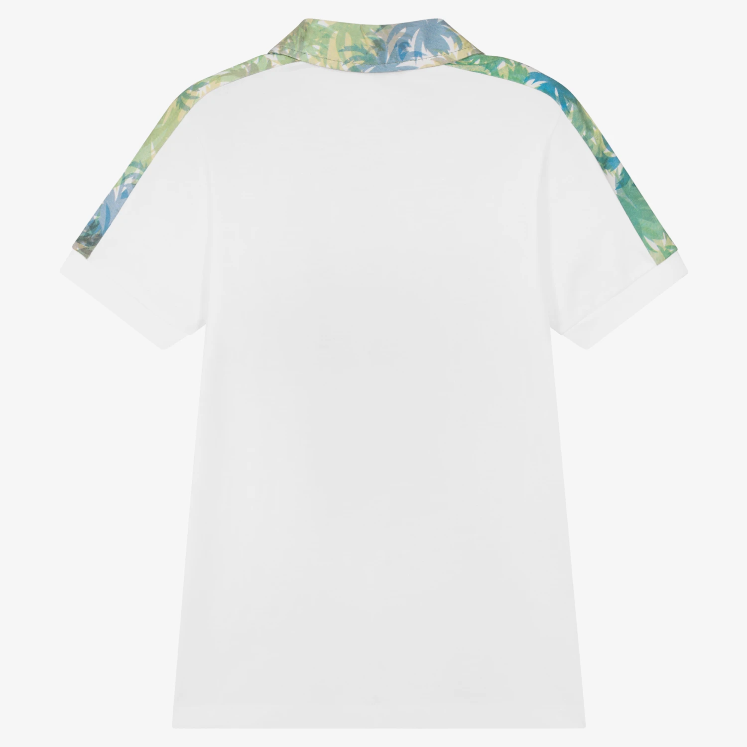 White polo shirt for boys by AIGNER, made in soft and comfortable cotton jersey. It has colourful palm tree patterned trims, with the designer’s signature ‘A’ horseshoe logo embroidered on the chest pocket in white. There are branded button fastenings on the front.