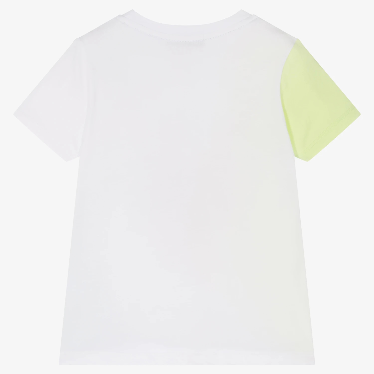 Cool white T-shirt for boys from AIGNER, with two tones of green colourblocked sections. Made in soft cotton jersey and with a traditional crew neck, it is casual and comfortable. The brand’s signature ‘A’ horseshoe logo is embroidered on the chest in navy blue for a designer touch.