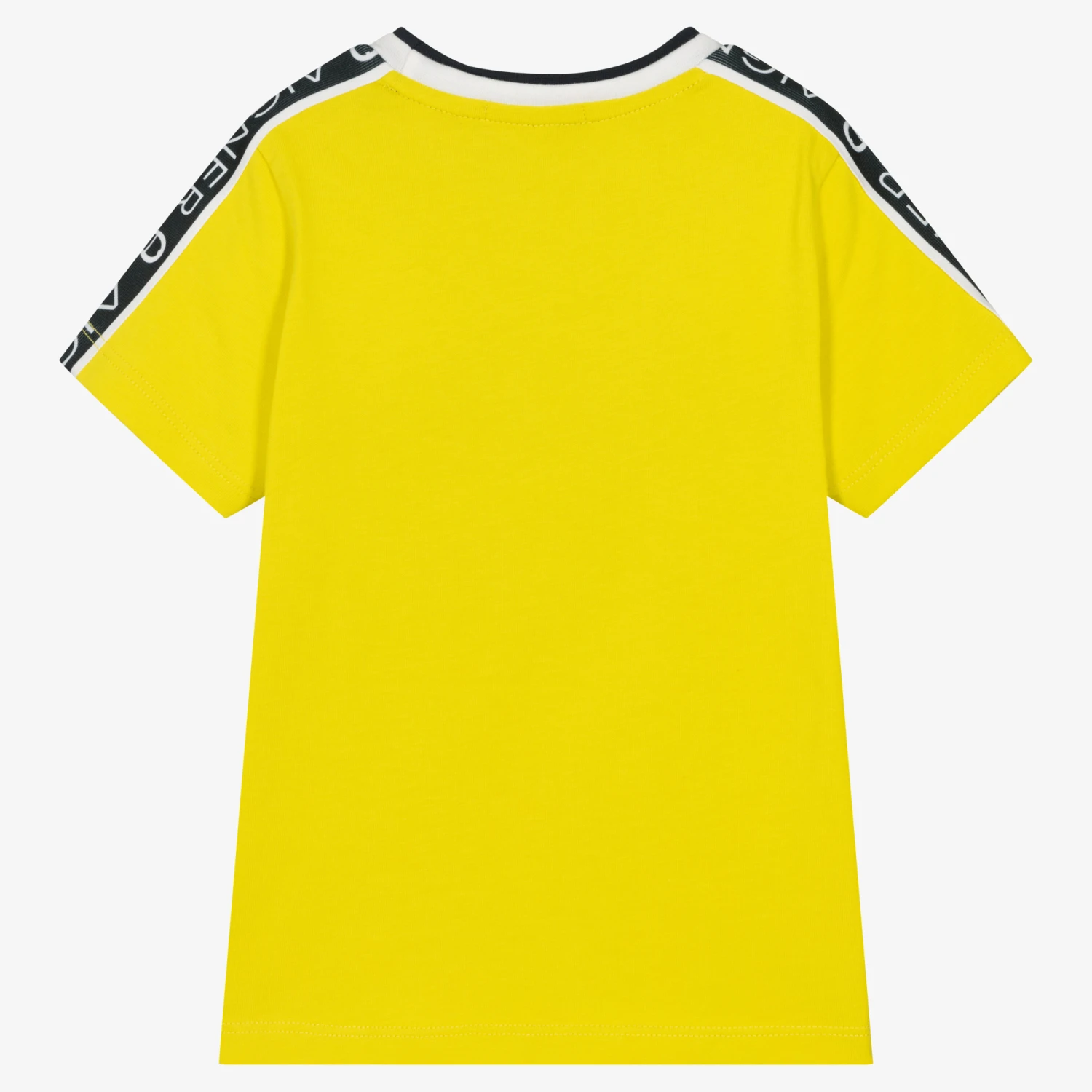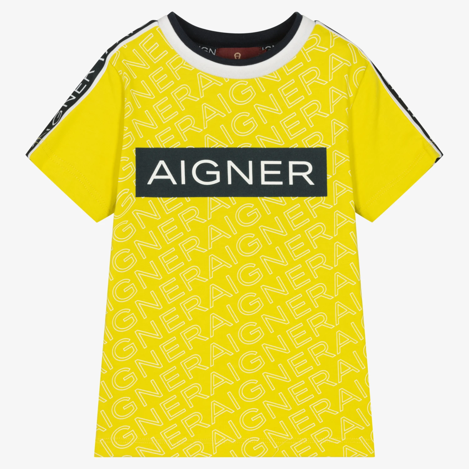 Vibrant acid yellow T-shirt for boys from German brand AIGNER, with a white logo pattern on the front. It is made in soft and stretchy cotton jersey, with a navy blue logo panel across the chest and logo tape trim across the shoulders and sleeves.