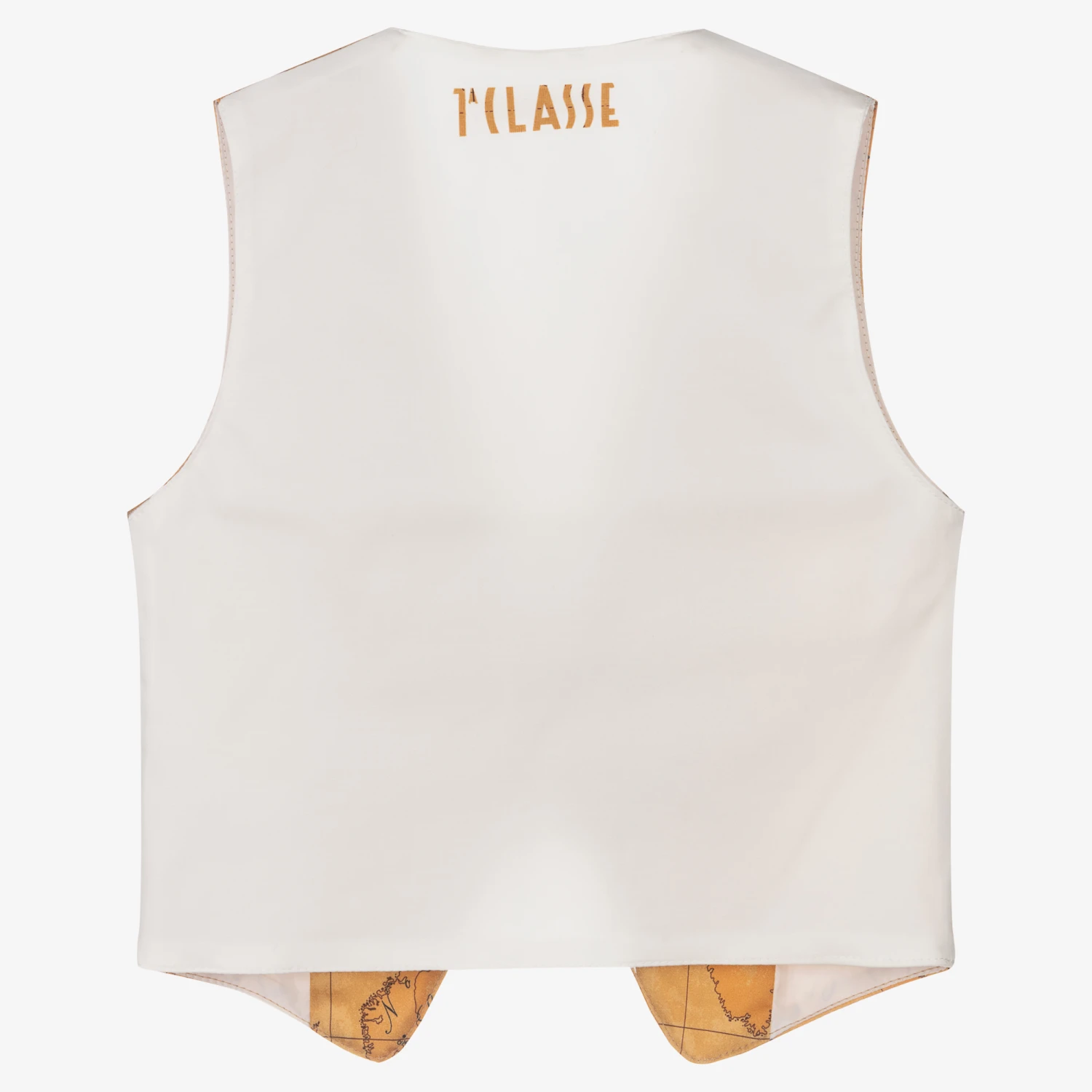 Unmistakably Alviero Martini, this smart waistcoat for boys is patterned in the Italian designer’s signature dark beige Geo map print. Made in smooth cotton sateen with a satin lining, it is white on the back with a beige 1a Classe logo. To complete the look, it fastens with a white branded button on the front.