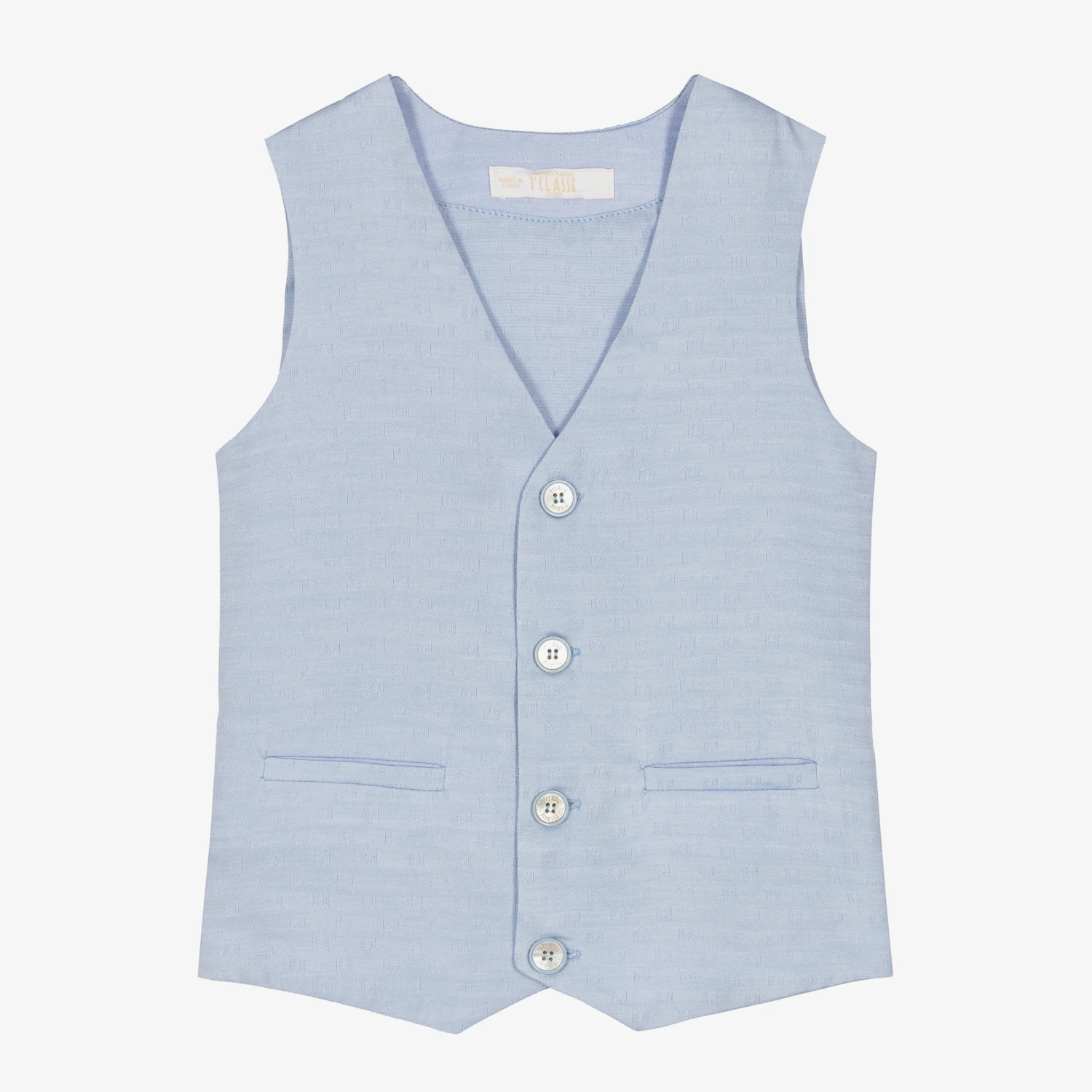A pale blue waistcoat for little boys by Alviero Martini, woven in a luxuriously soft cotton blend. Smart for layering, this waistcoat is patterned with a interwoven monogram design all-over, for subtle designer sophistication. There are decorative pockets and shiny pearlescent button fastenings, intricately embossed with the brand’s signature 1a Classe logo.