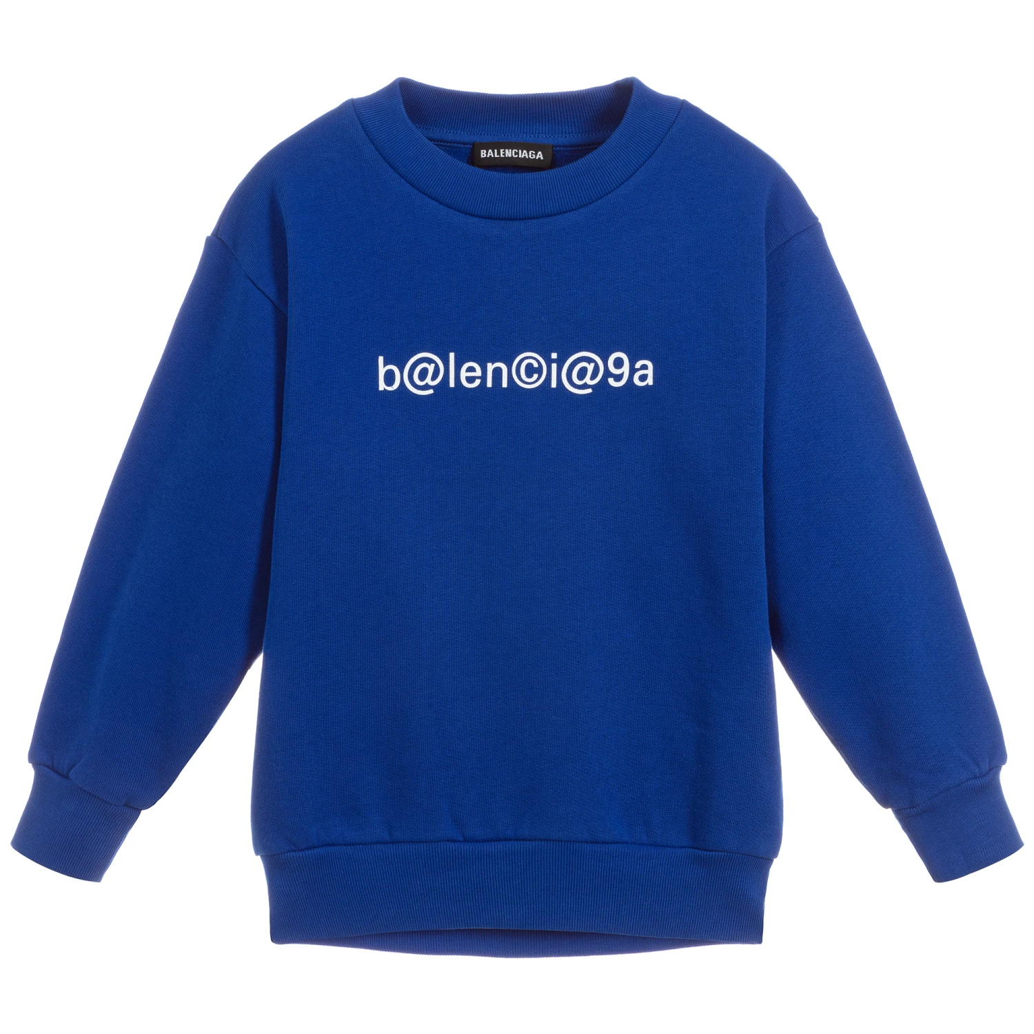 Mini-me, bright blue, oversized sweatshirt for both boys and girls by luxury designer Balenciaga. It is made in comfortable, mid-weight, cotton jersey with a fleecy inside. The brand’s white Symbolic logo is printed on the front.