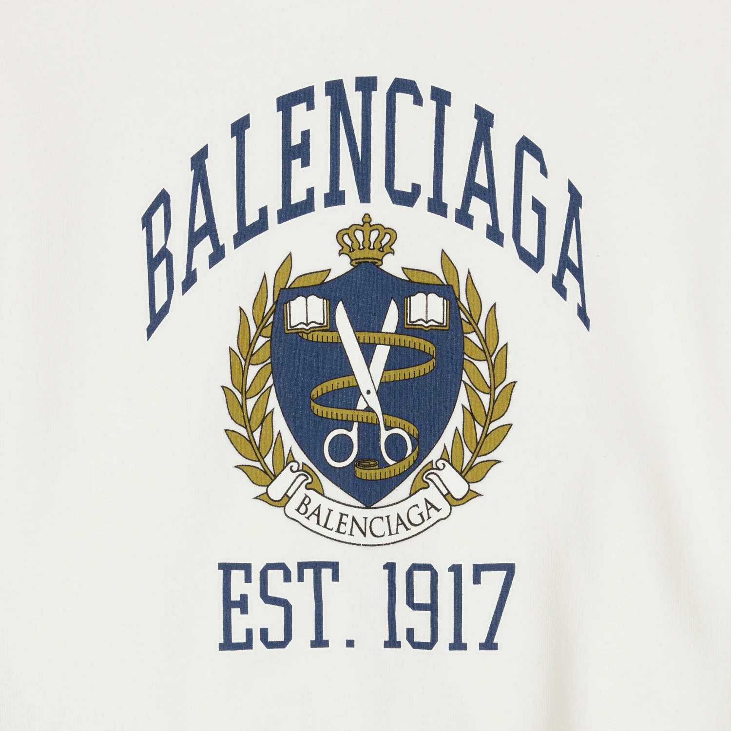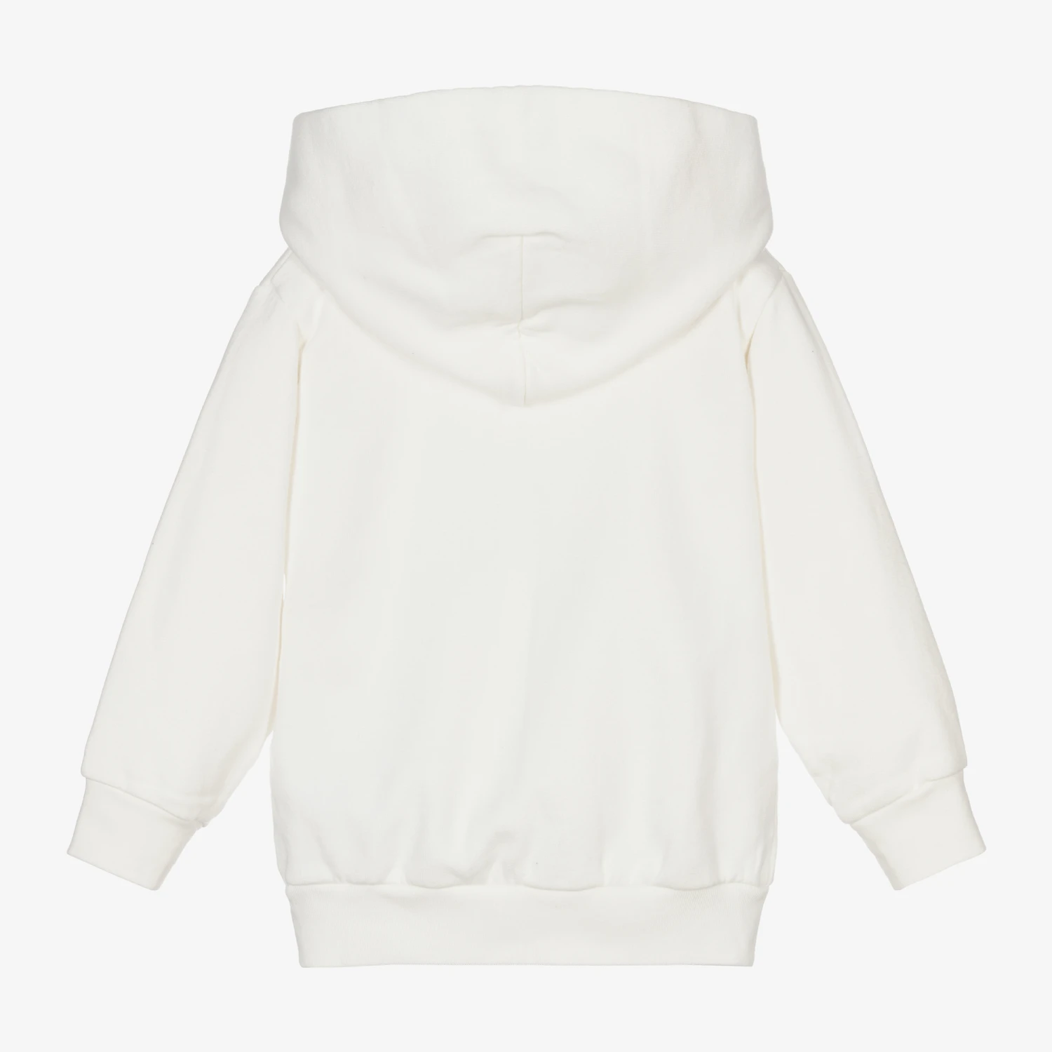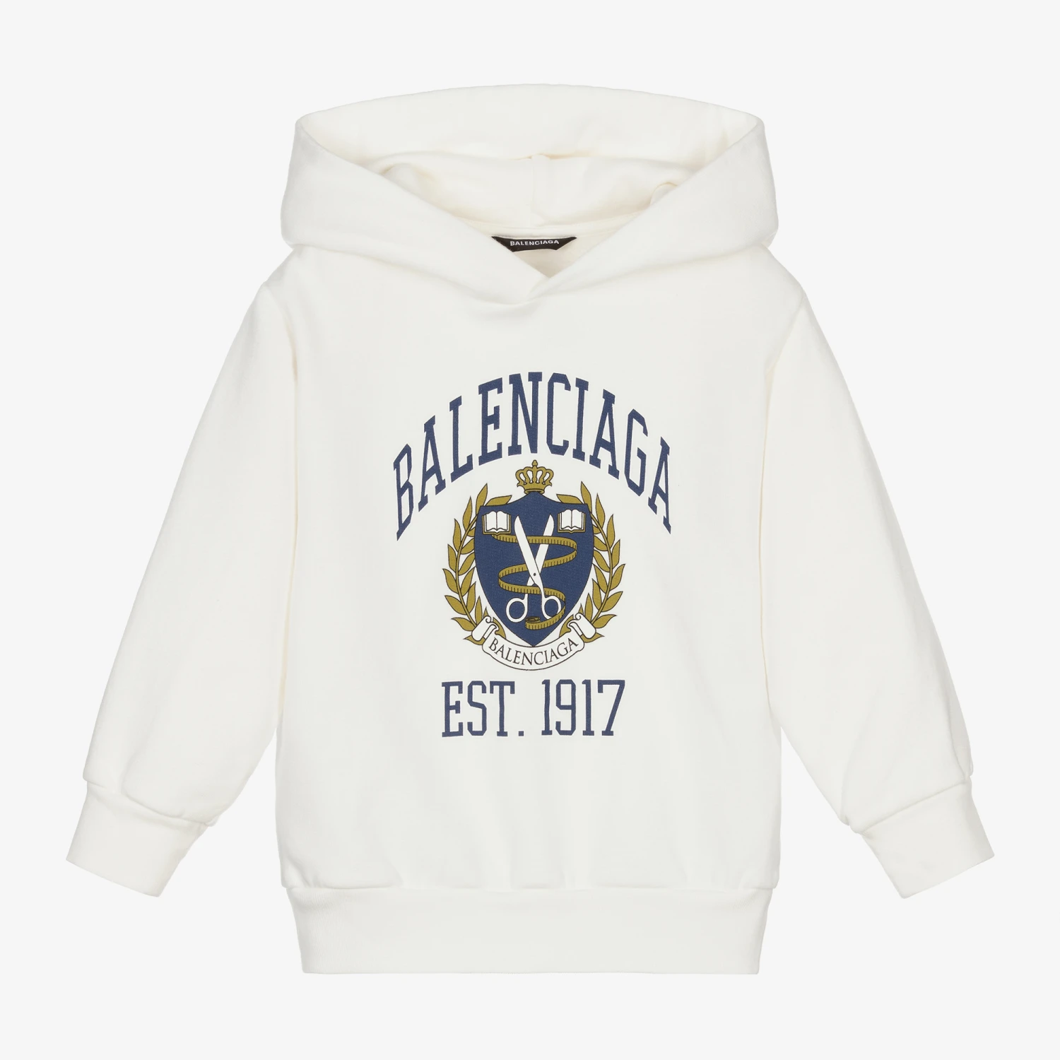 An off-white hooded sweatshirt by luxury brand Balenciaga, with a blue and green college logo print on the front. Designed in an oversized fit for boys and girls, it is made in cotton jersey with a soft fleecy underside.
