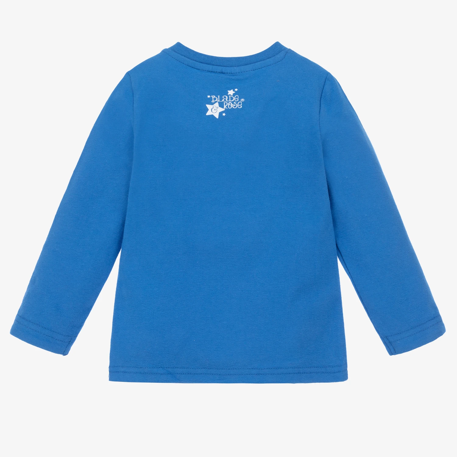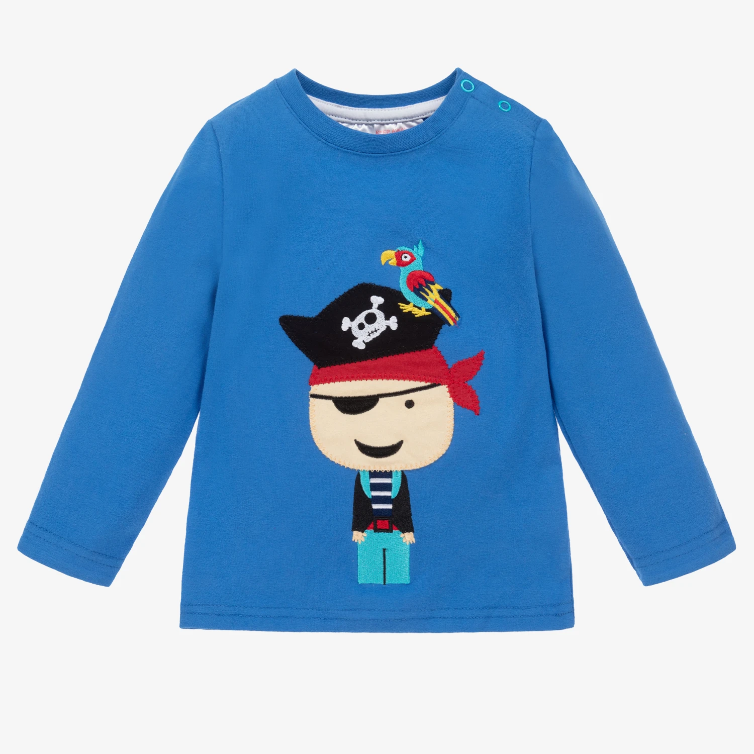 Blue long-sleeved top for little boys by Blade & Rose, made in soft, mid-weight cotton with a brushed feel. Warm and cosy, it has a colourful Percy the Pirate appliqué on the front. There are contrast white trims on the inside of the cuffs and neck and useful popper fastenings on one shoulder for easy dressing.