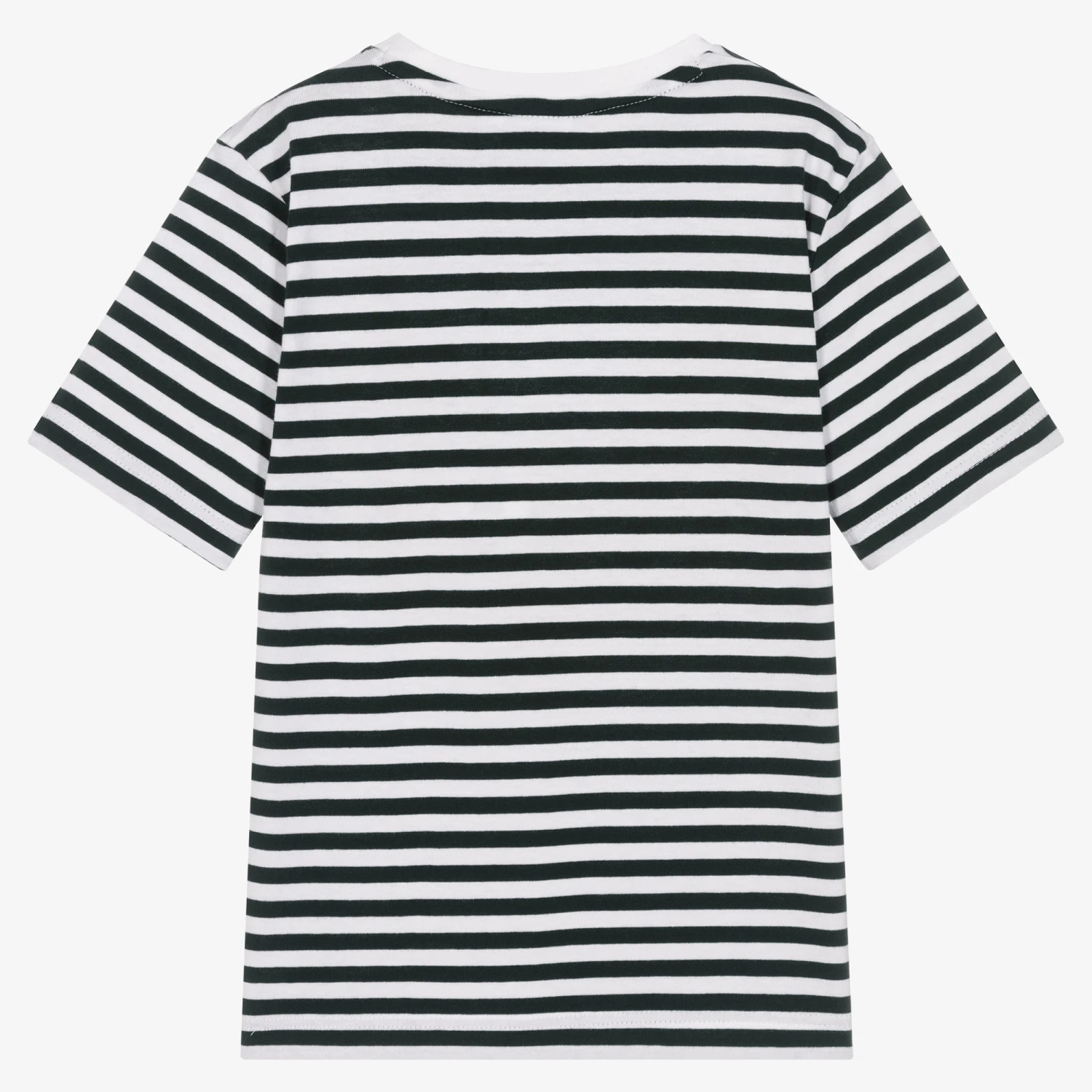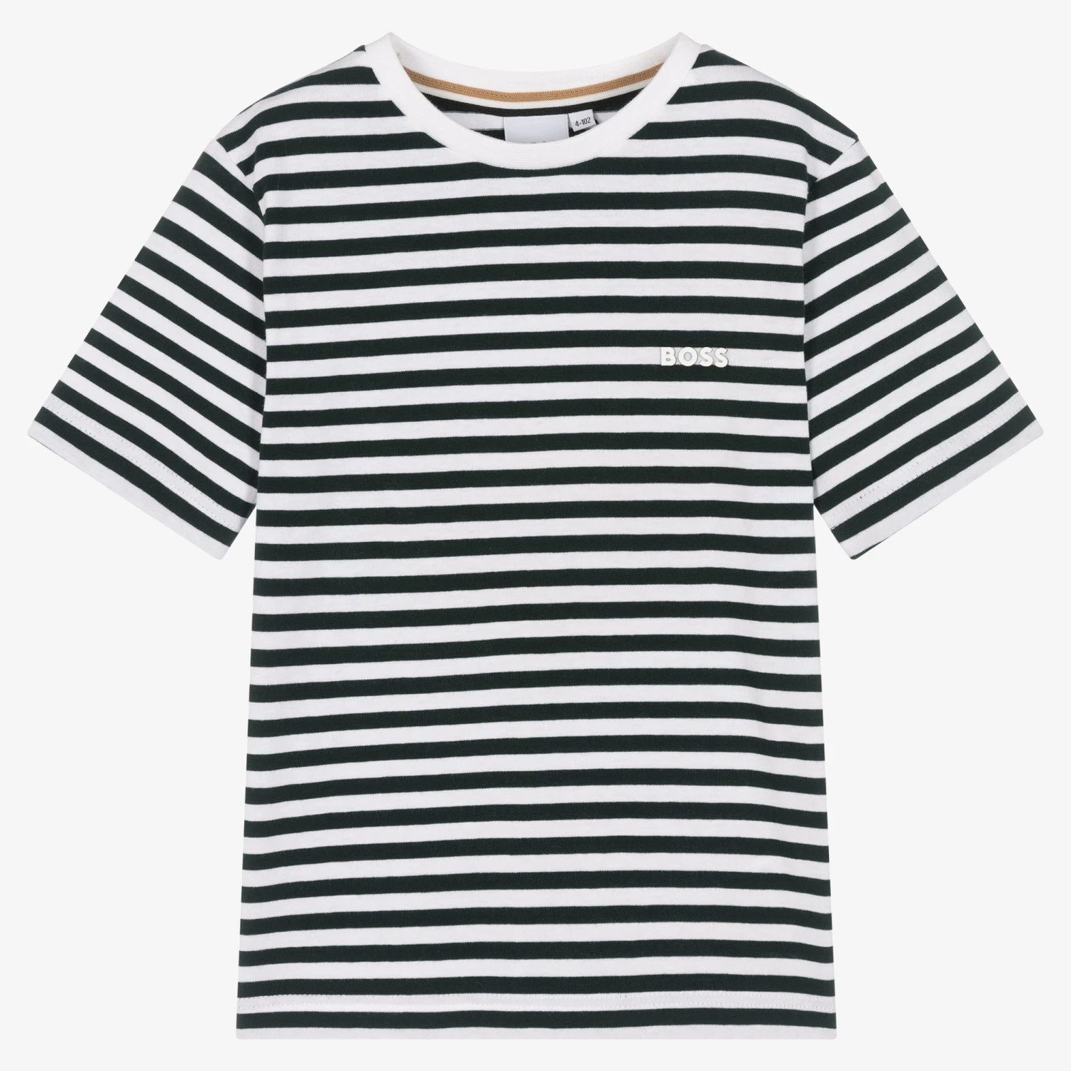 Forest green and white striped T-shirt for boys by BOSS, made in soft cotton jersey. This wardrobe staple showcases a white rubberised logo print on the chest for a branded look.