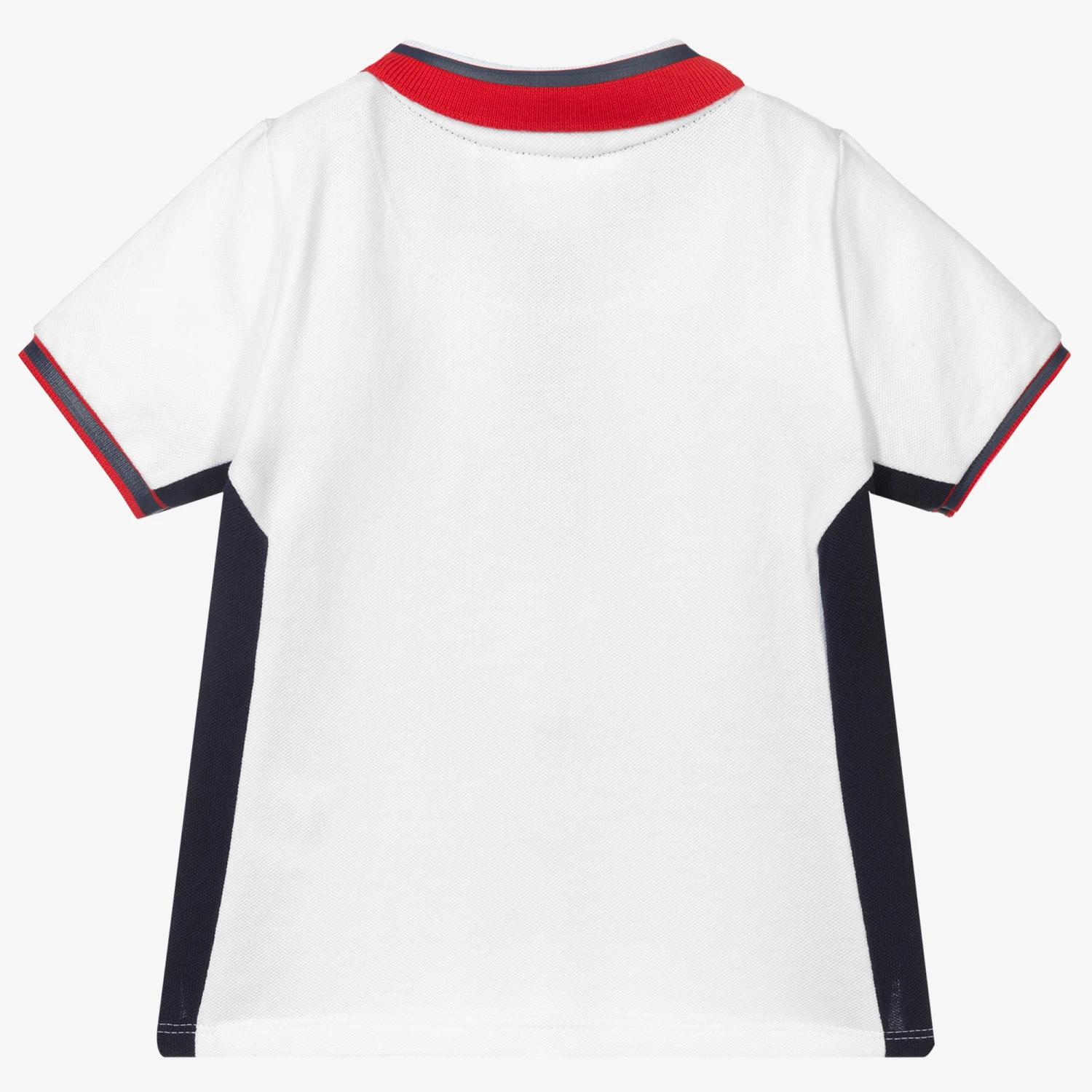 White polo shirt for younger boys by BOSS Kidswear. Made with soft cotton piqué, it has navy blue side panels, red and blue trims, and a rubberised logo on one side. It fastens with buttons on the front.