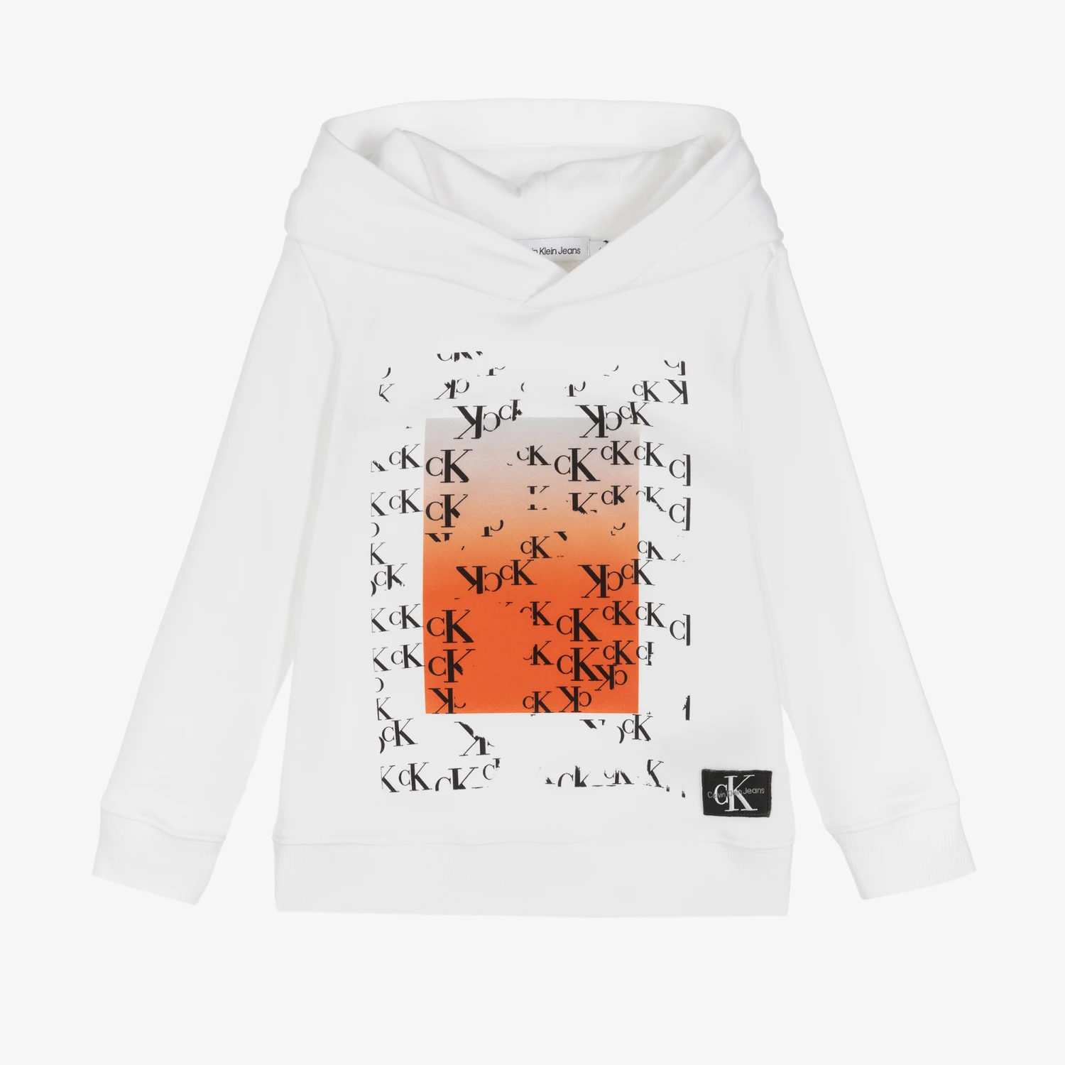 White hoodie by Calvin Klein Jeans, made in mid-weight sweatshirt jersey. Suitable for boys, the front features a graphic placement logo and an embroidered logo patch at the hip.