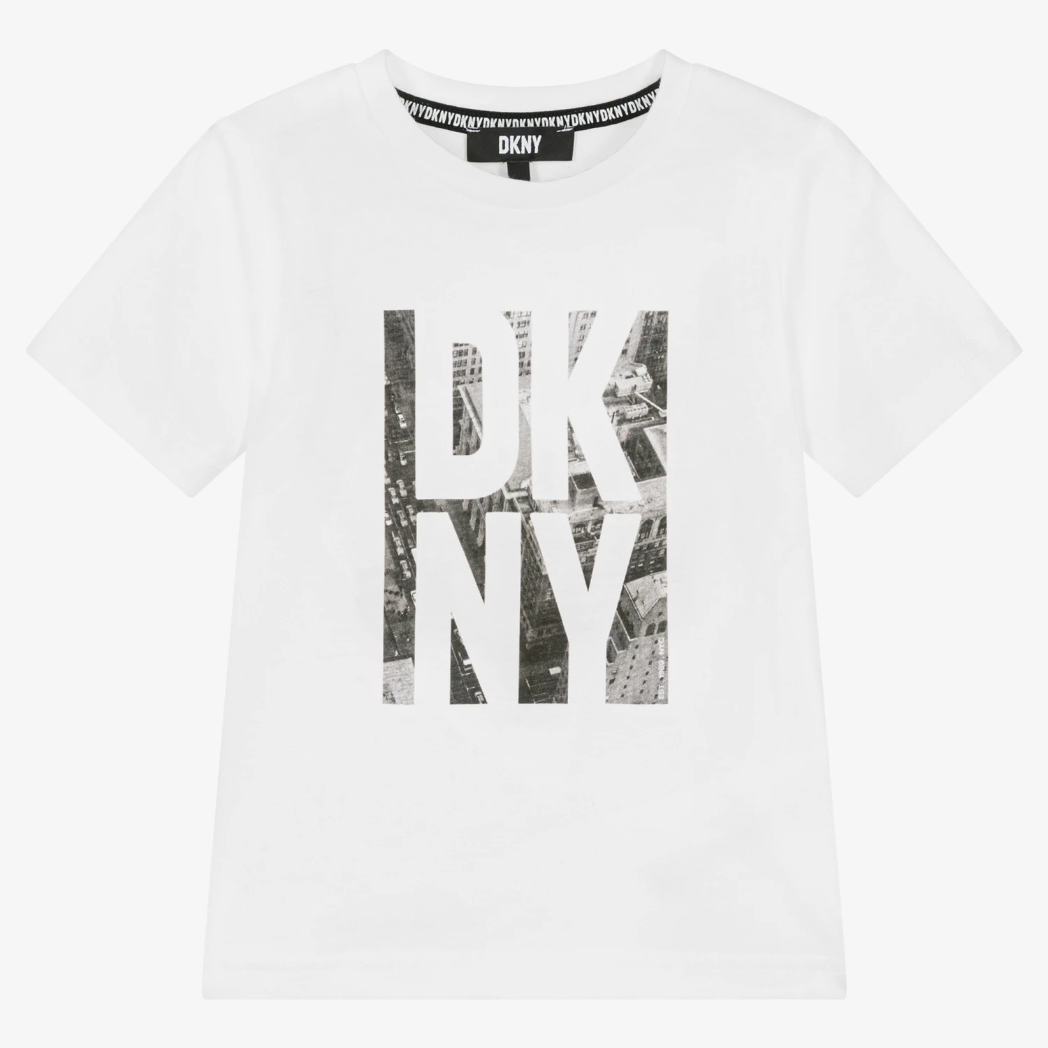 White crew neck T-shirt for boys by DKNY, made in soft cotton jersey. In a regular fit, this casual T-shirt is enhanced with a stacked logo on the front against a contrasting black and white New York graphic print.