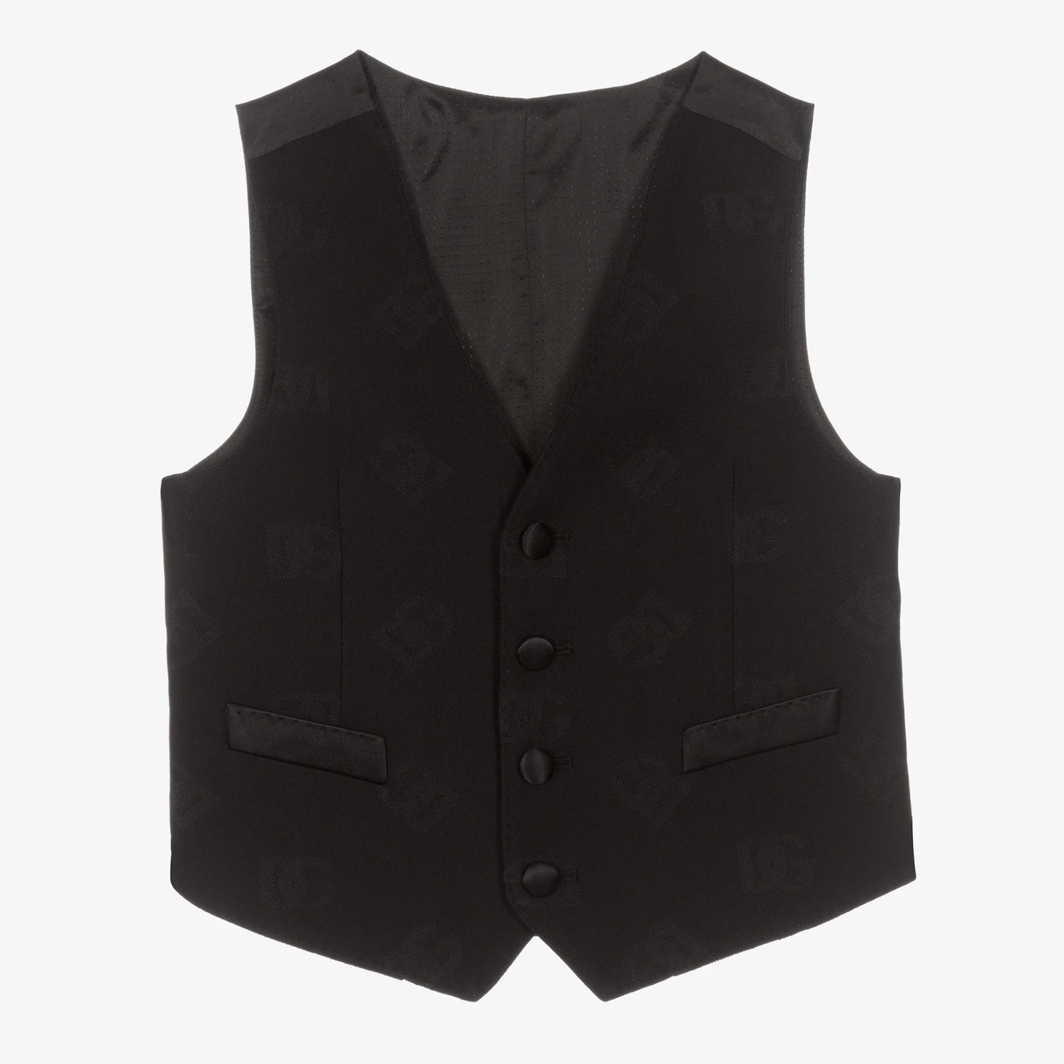 Boys smart black waistcoat by Dolce & Gabbana. Woven in a luxury wool blend, the soft feel fabric has a jacquard crossover DG logo pattern within the weave. There are fabric-covered buttons and faux pockets on the front with silky trims. The back has a silky fabric with a microdot pattern and a metal back adjuster.