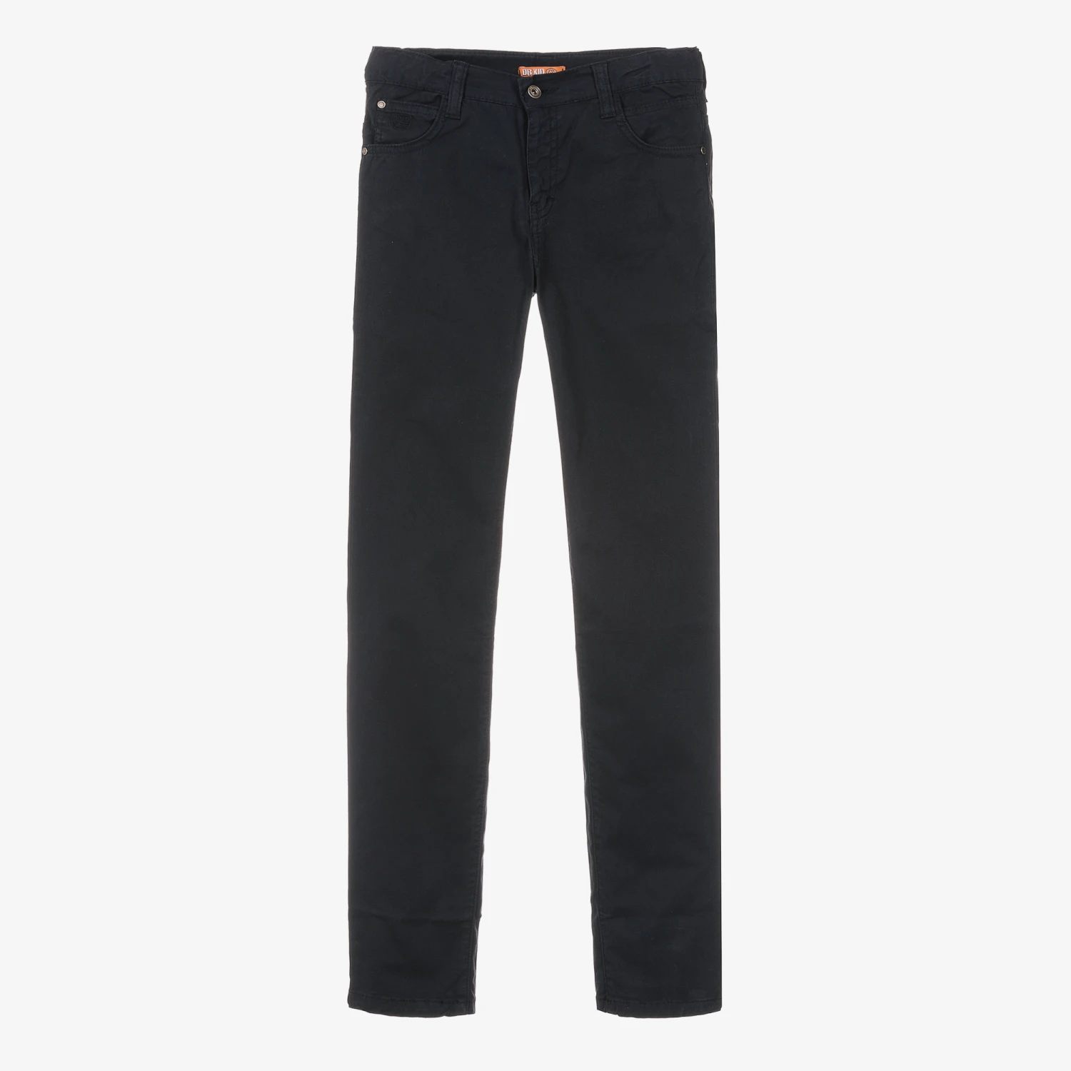 Comfortable navy blue straight-leg trousers for boys by Dr. Kid. Made in a soft cotton, with a slight stretch, they fasten with a button and zip at the front. In a classic five-pocket style, they have an adjustable waist to ensure a good fit, and there is an embroidered logo on the coin pocket, for a discreet designer finish.