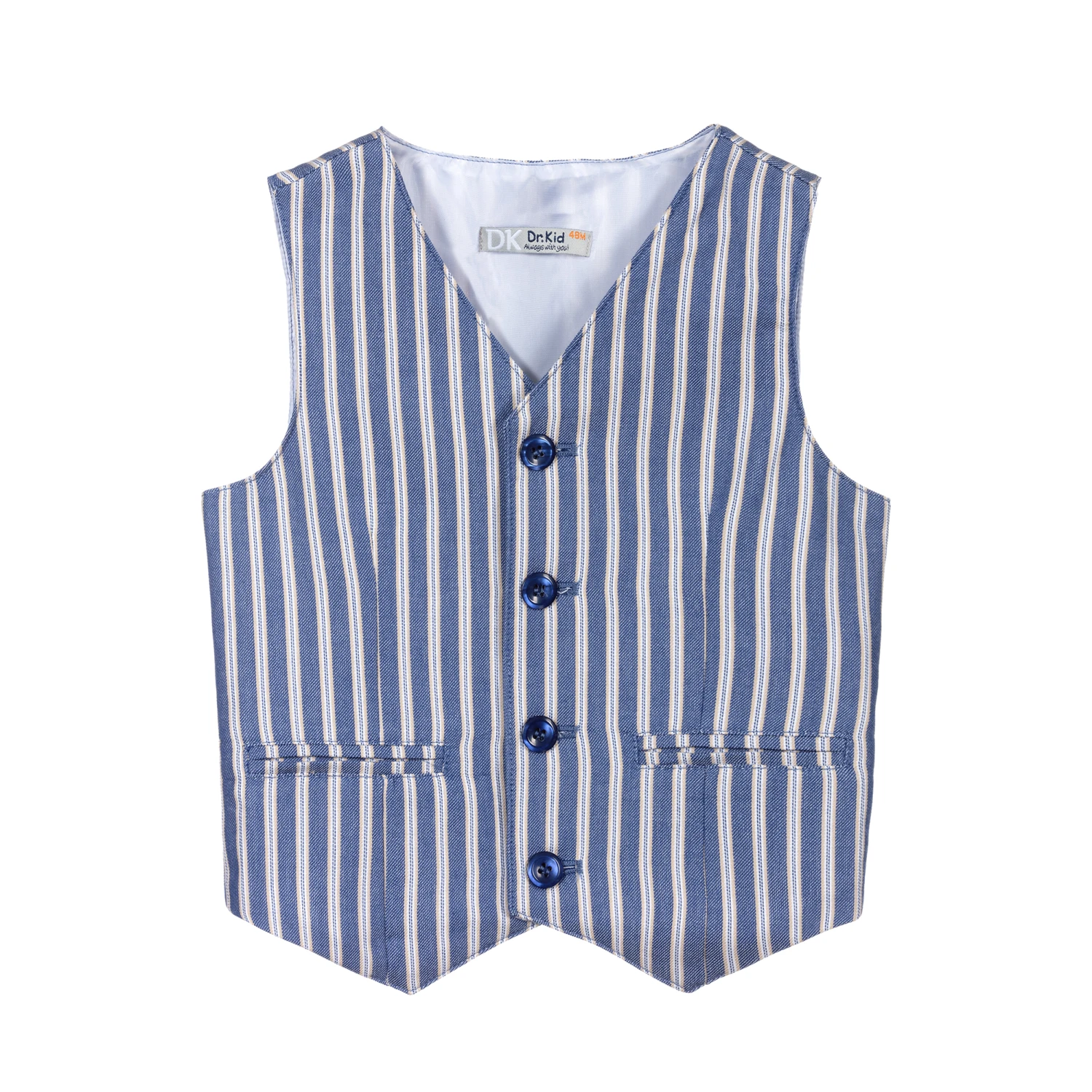 Blue, beige and white striped waistcoat for little boys by Dr. Kid. It is made in lightweight cotton and has a silky satin lining.