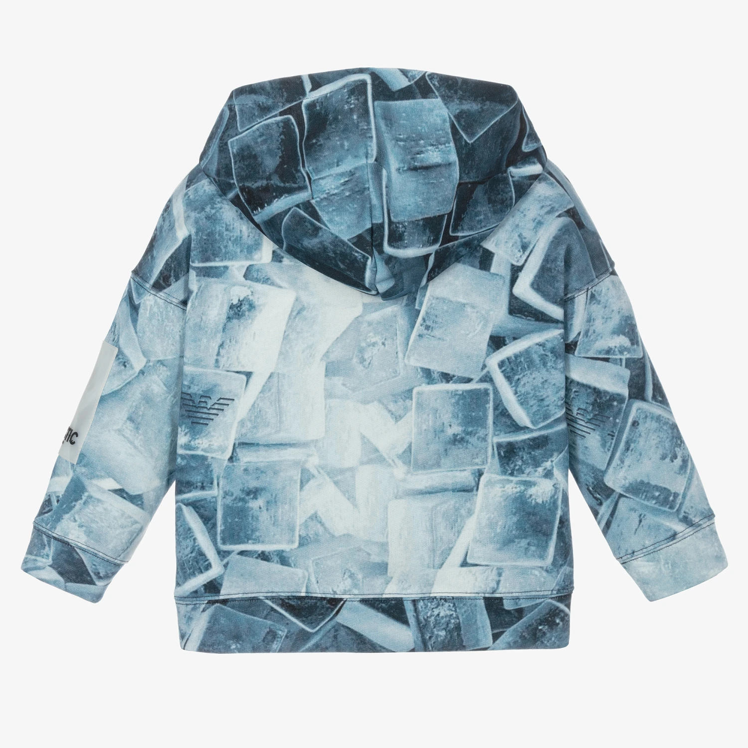 Boys cool blue Mini-me hooded sweatshirt, part of the Emporio Armani’s Earctic capsule collection. The all-over ice cube graphic print incorporates the brand’s iconic Eagle logo for a distinctive look and it has a large, white and black rubberised logo patch on one sleeve. So comfortable in a relaxed fit, it is made from organic cotton sweatshirt jersey with a soft fleecy inside, cuffed wrists and a kangaroo pocket on the front.