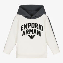 Boys blue and pale ivory varsity-style hoodie by luxury Italian brand Emporio Armani. Made in a stretchy sports jersey, it has the designer’s logo in super soft velvet appliqué on the front.