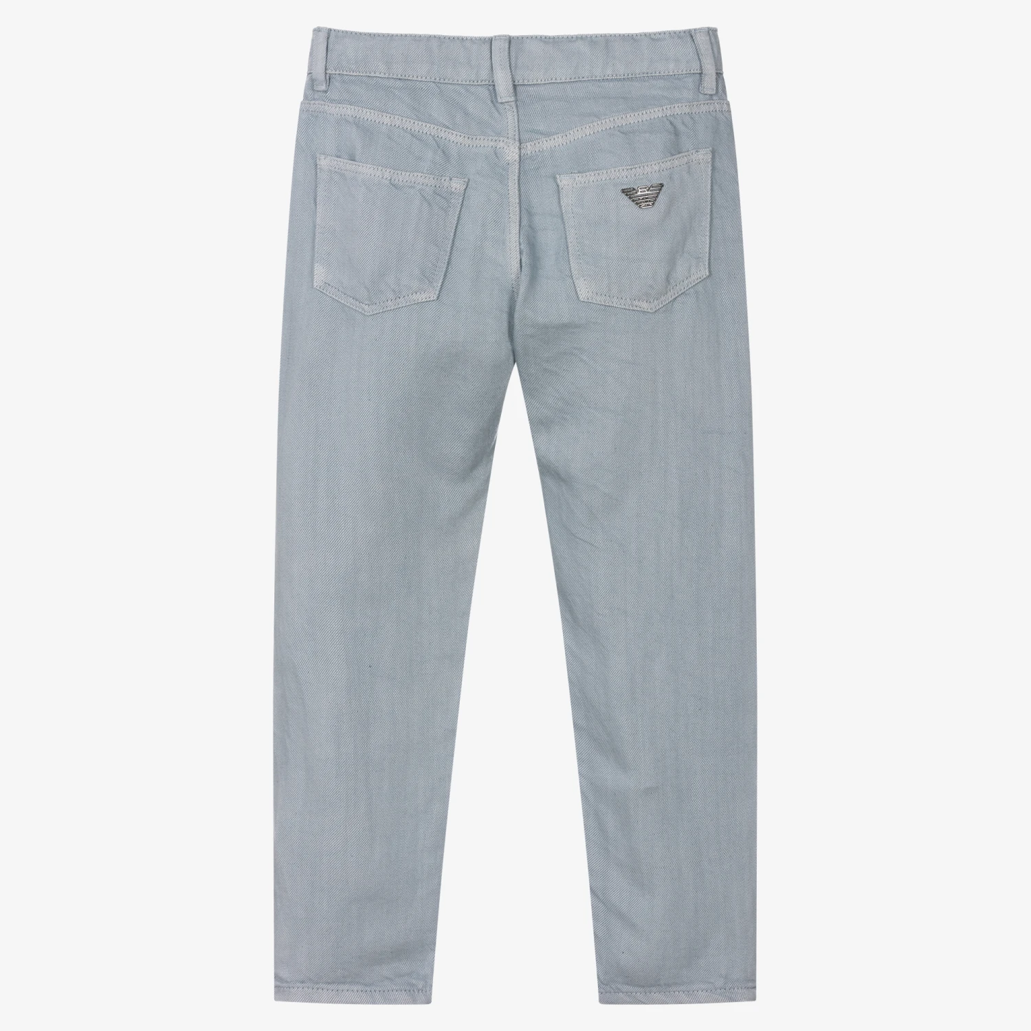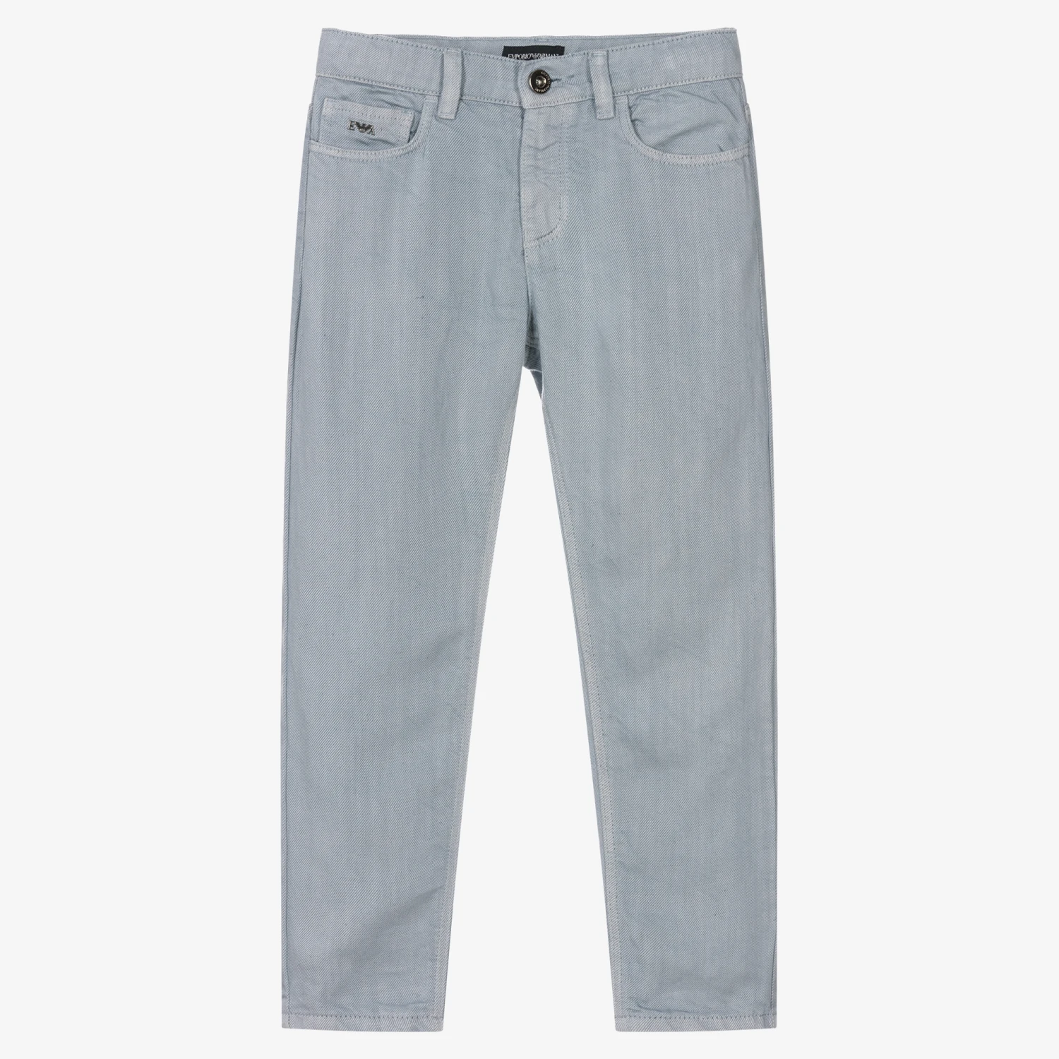 Light blue trousers for boys by Emporio Armani. Made in a soft lyocell and linen blend, they have an adjustable waistband for a comfortable fit. Designed in the style of jeans, they have classic five pocket styling, with a metal logo plate on the front and a metal Eagle logo plate on the back. There is a branded button and zip fastening for an extra designer touch.