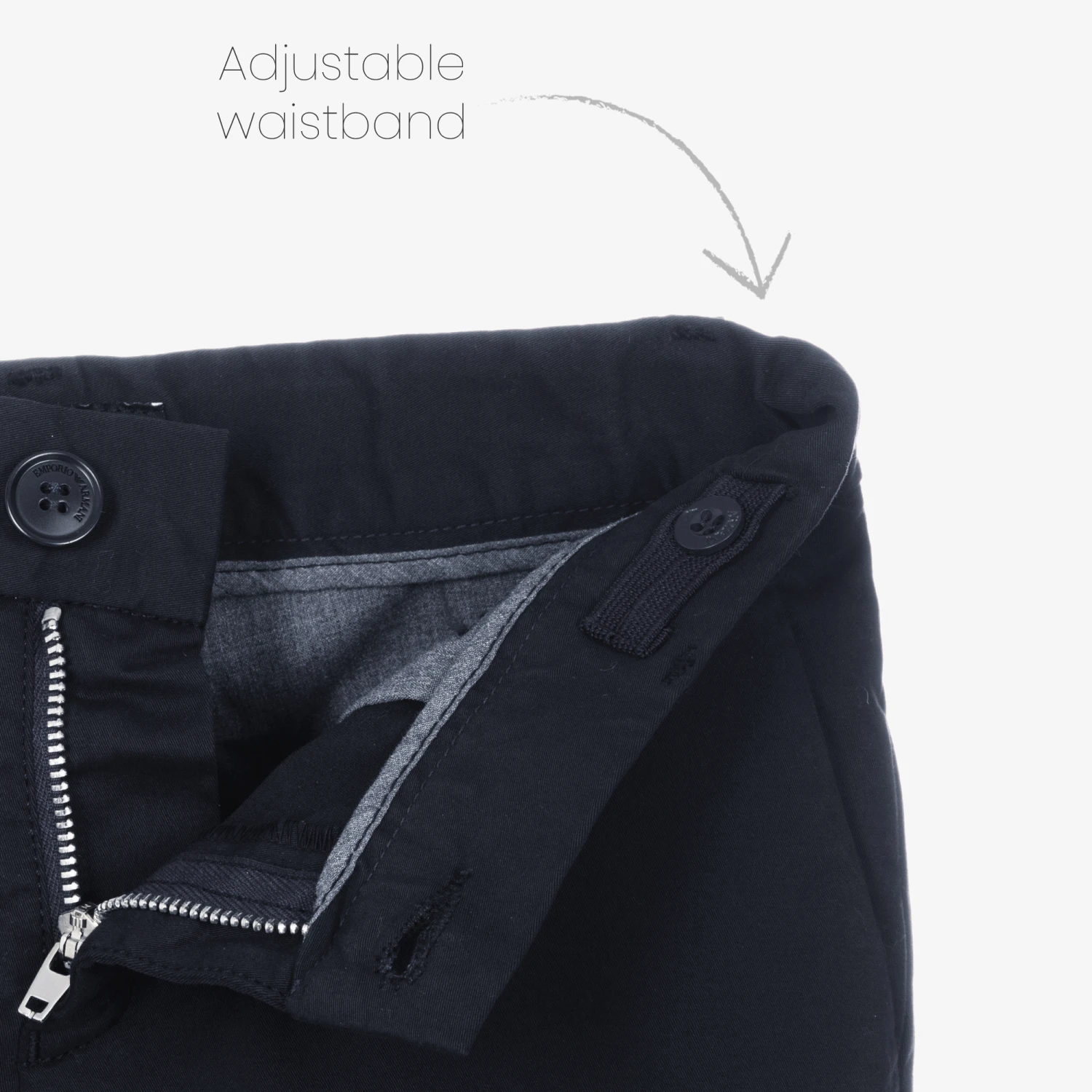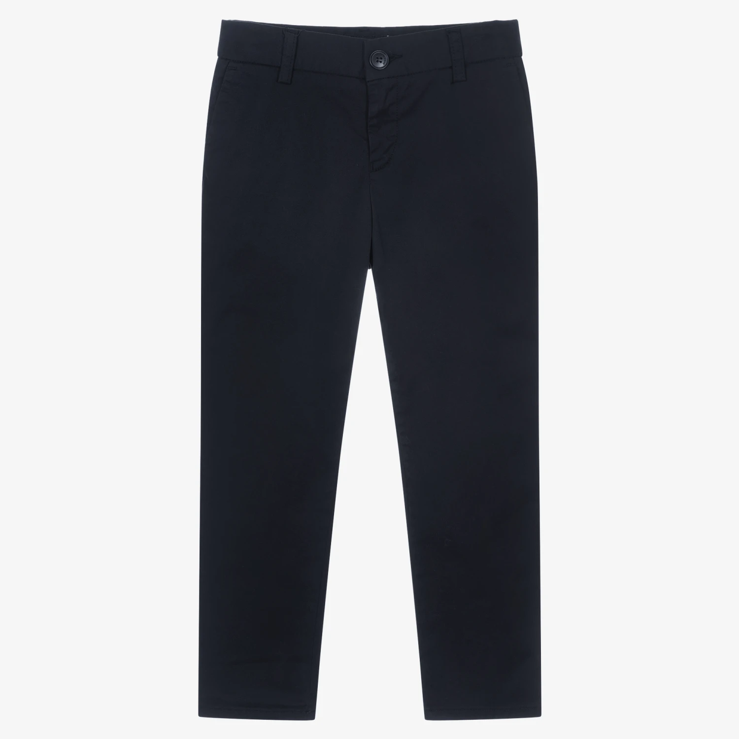Navy blue chino trousers for boys by Emporio Armani, made in soft mid-weight cotton, with pockets on the front and back. There is a metal Emporio Armani logo on the back. They fasten with a button and zip and have useful adjustable waist.