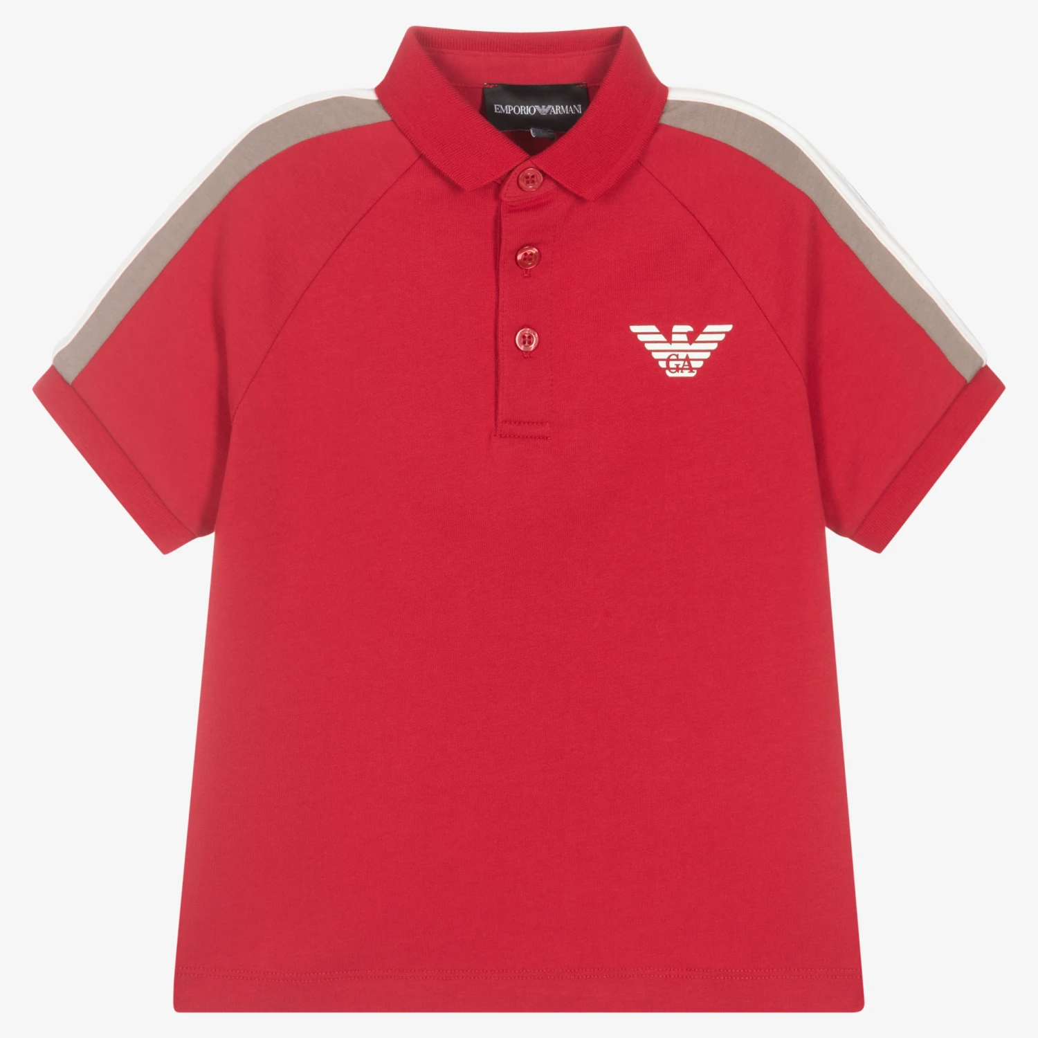 Casual red polo shirt for boys by Emporio Armani, with a white and beige striped trim on the sleeves. Made in soft cotton jersey, it has the brand’s rubberised iconic Eagle logo on the chest in ivory. There are branded button fastenings on the front for a subtle designer finish.