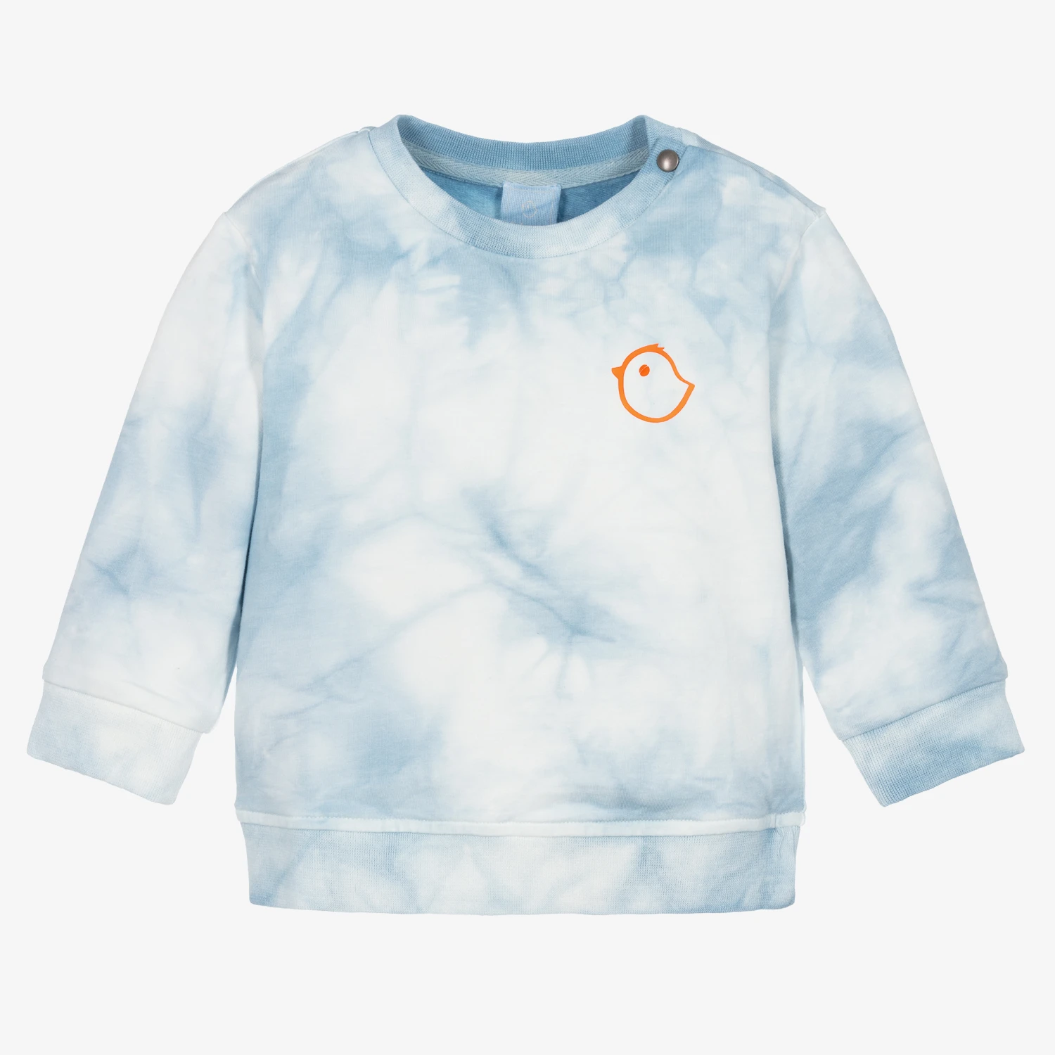 Blue and white tie-dye sweatshirt for little boys from Italian brand Falcotto by Naturino, made in soft cotton jersey. This cool design has a neon orange chick logo on the chest and a matching neon orange logo on the back. There are ribbed trims and useful popper fastenings on one shoulder to help with dressing.