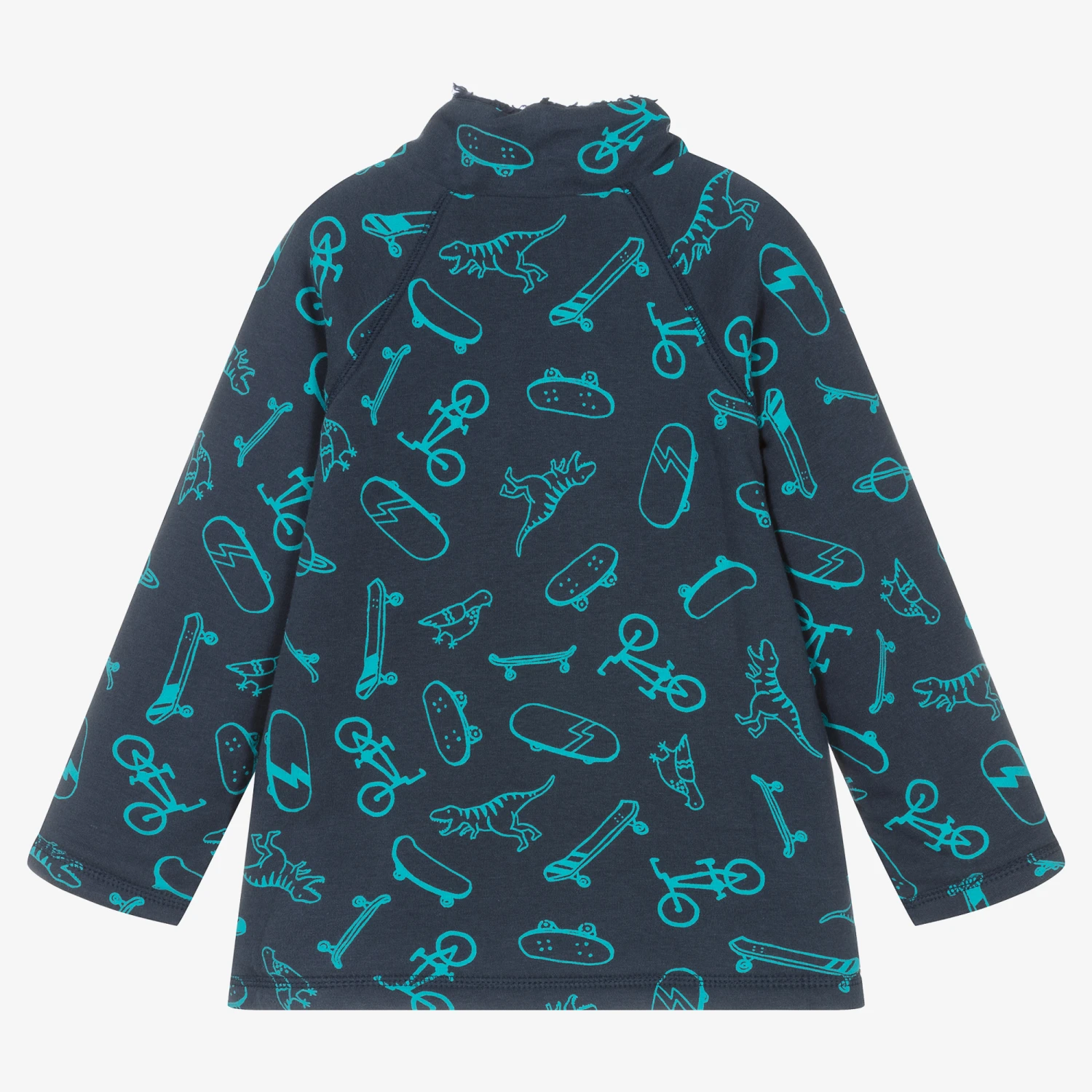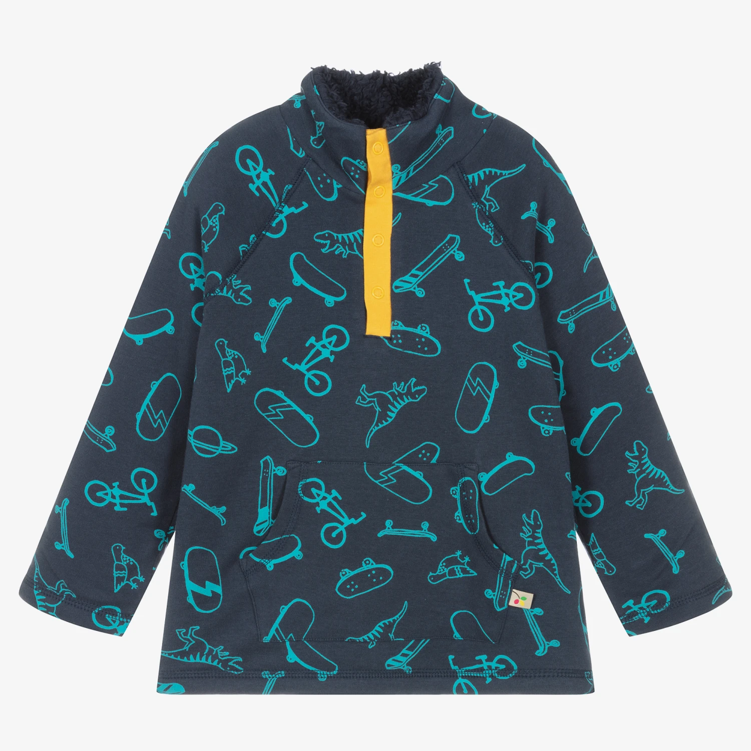 Navy blue sweatshirt for boys by British brand Frugi, made in soft organic cotton jersey. It has a turquoise blue dinosaur, skateboard and bicycle all-over print. Great for outdoor wear, it has a warm, cosy Snuggle Fleece lining and a high collar for extra warmth. It has a front patch pocket and a contrast yellow placket with popper fastenings on the front.