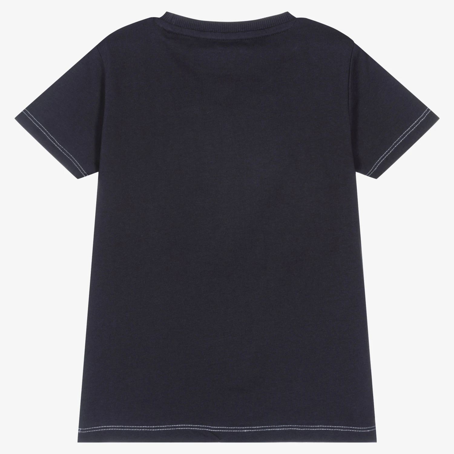 Navy blue cotton T-shirt for little boys by American brand Guess, made in comfortable jersey for relaxed days. It has the designer’s shiny, rubberised navy blue logo on the front, with white overstitching on the cuffs and hemline. This T-shirt contains in-conversion cotton fibre.