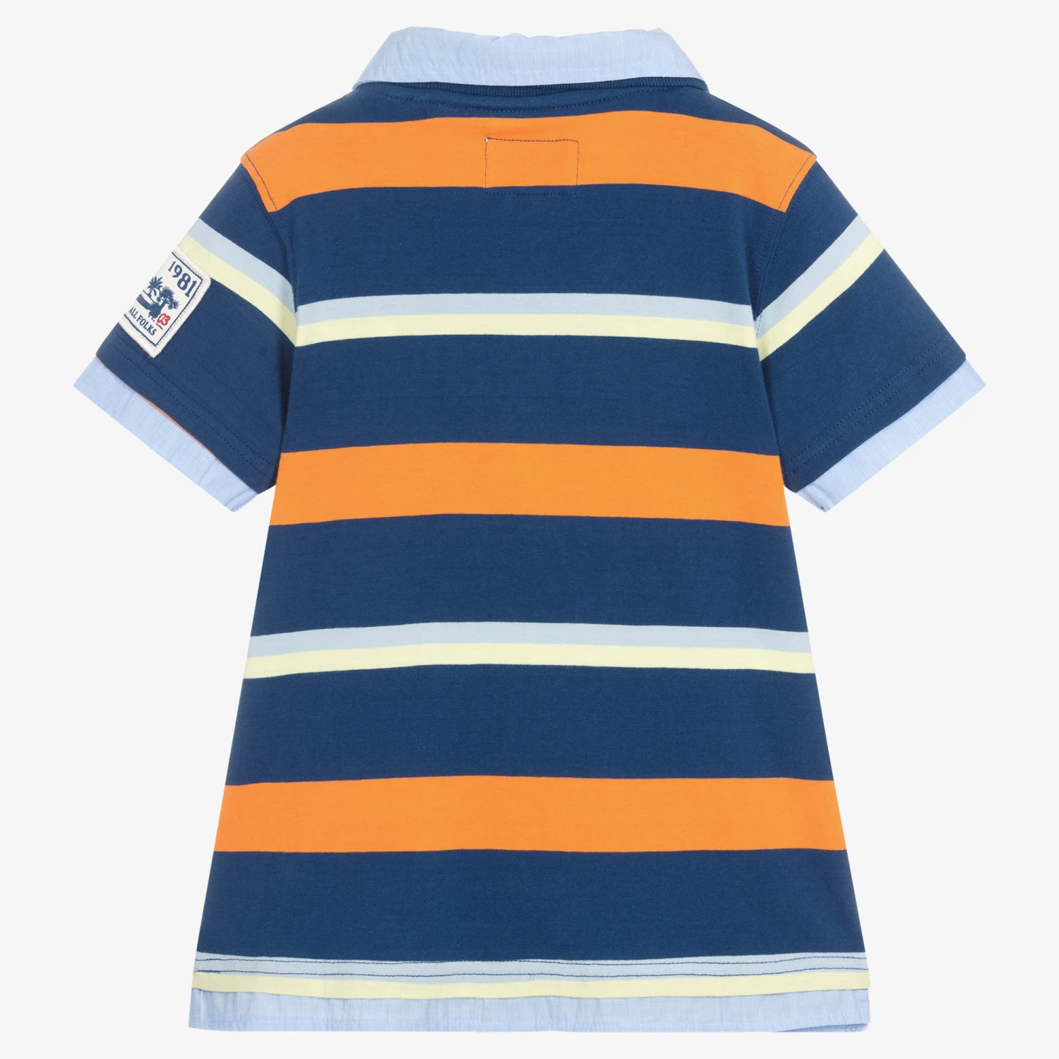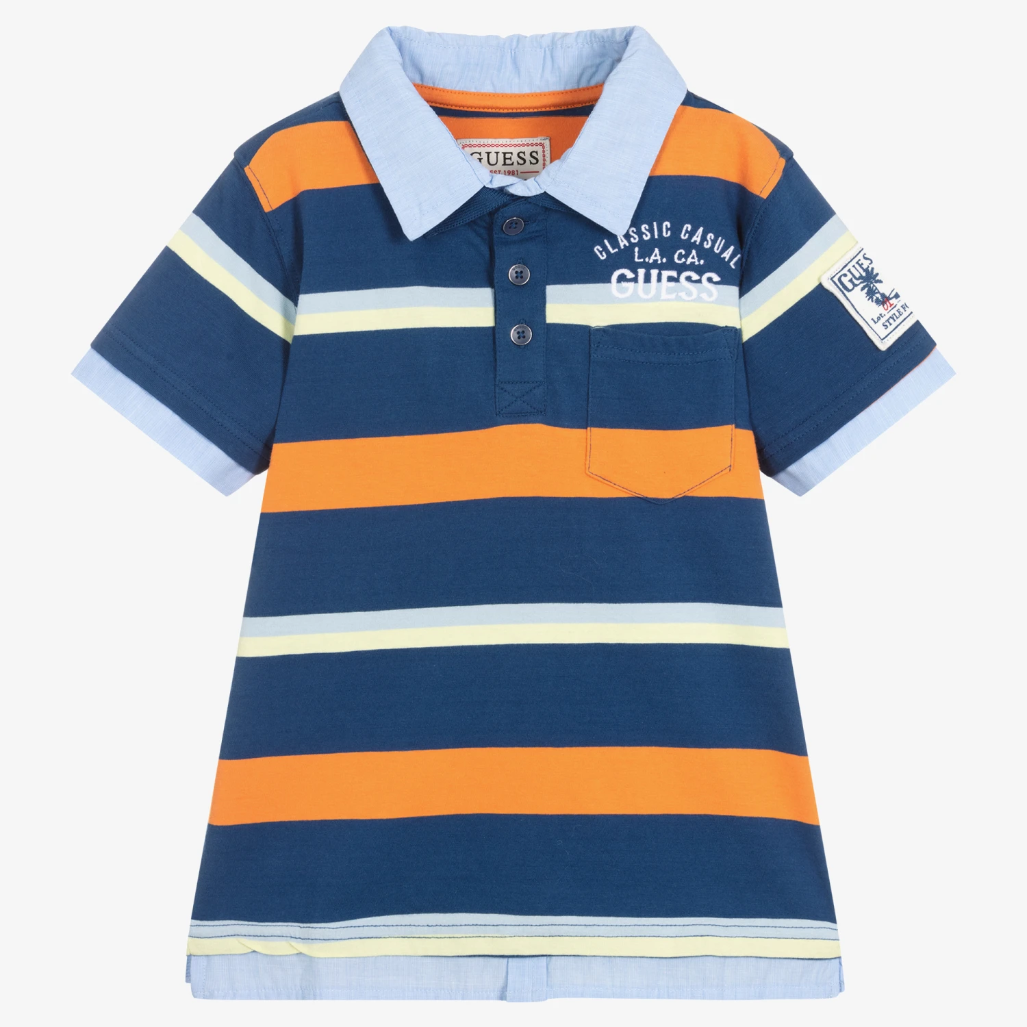 Blue organic cotton polo shirt by Guess, made in soft jersey. In classic polo styling, it has a woven blue collar, and woven trims on the cuffs and the hem. The front is patterned with orange and yellow stripes, and has a white holiday-inspired palm tree logo badge on one sleeve. Fastening with logo-embossed buttons on the front, it has a white logo appliqué on the chest for a branded finish.