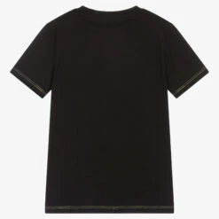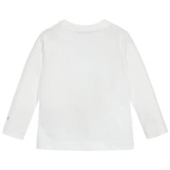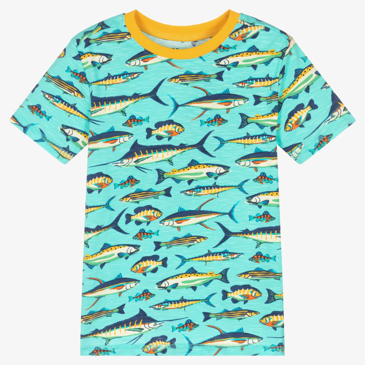 Blue crew neck T-shirt for boys by Hatley, made in soft cotton jersey. Patterned with fun graphic sharks all-over, it has a bright yellow ribbed neckline for a colourful, playful look.
