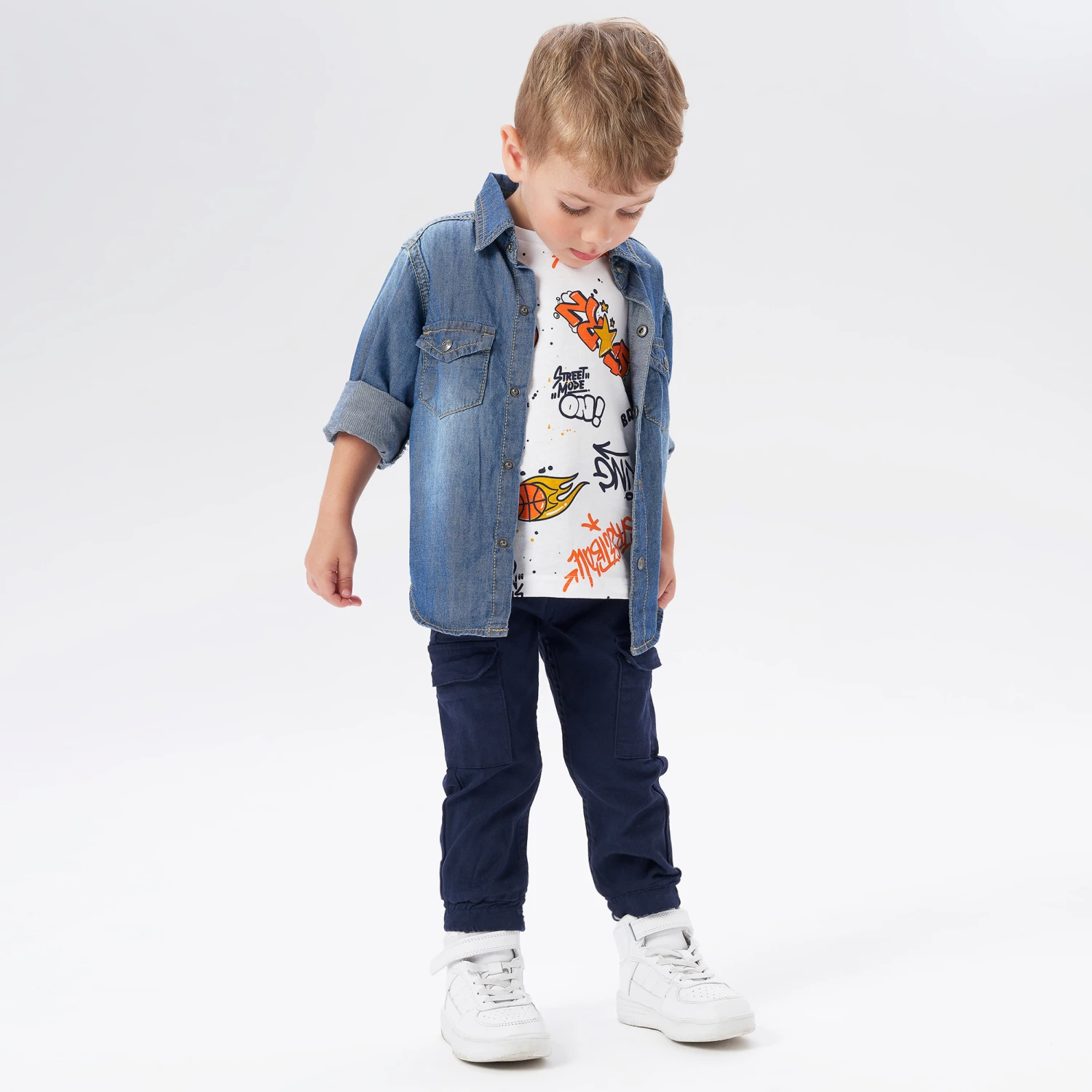Navy blue jogger style trousers for boys by iDO Baby, woven in soft cotton canvas. Easy and comfy to wear, they have drawstring waist and ankle cuffs that are elasticated. There are cargo pockets on the legs, with a branded jacron patch on the back for a designer finish.