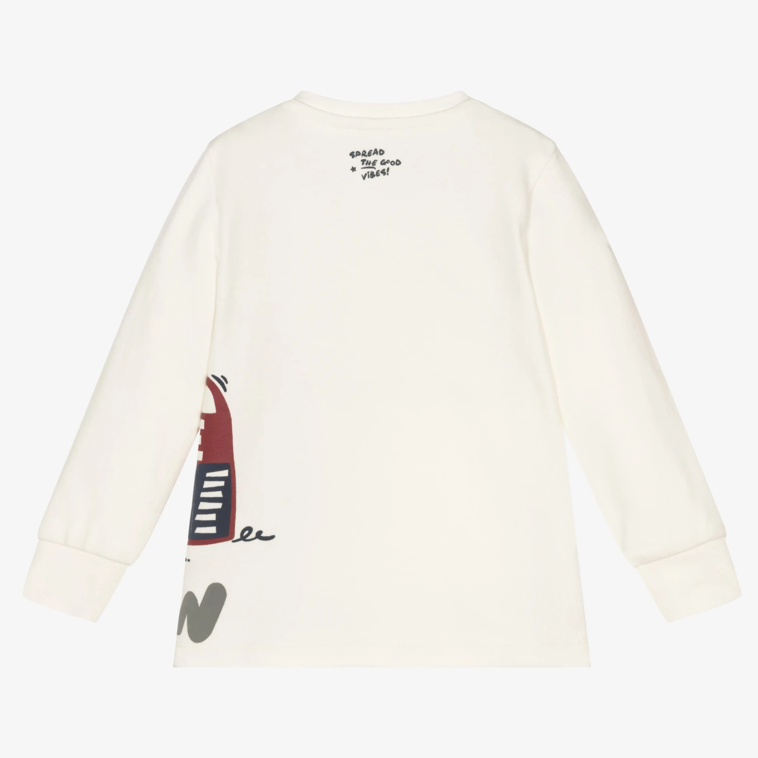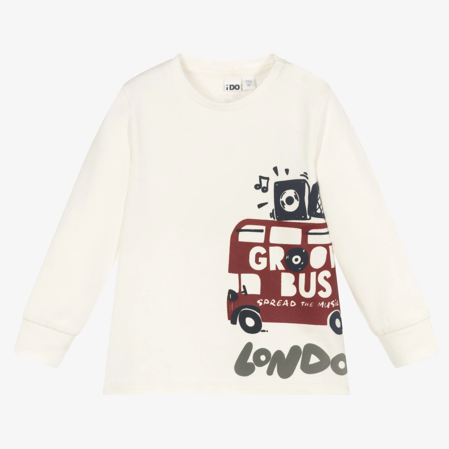 Ivory top for boys by iDO Baby, made from super soft cotton jersey for all day comfort, with a crew neck and ribbed wrists. There is a fun London “GROOVE” bus print on the front, and a small motivation slogan on the back. There are popper fastenings on one shoulder on smaller sizes.