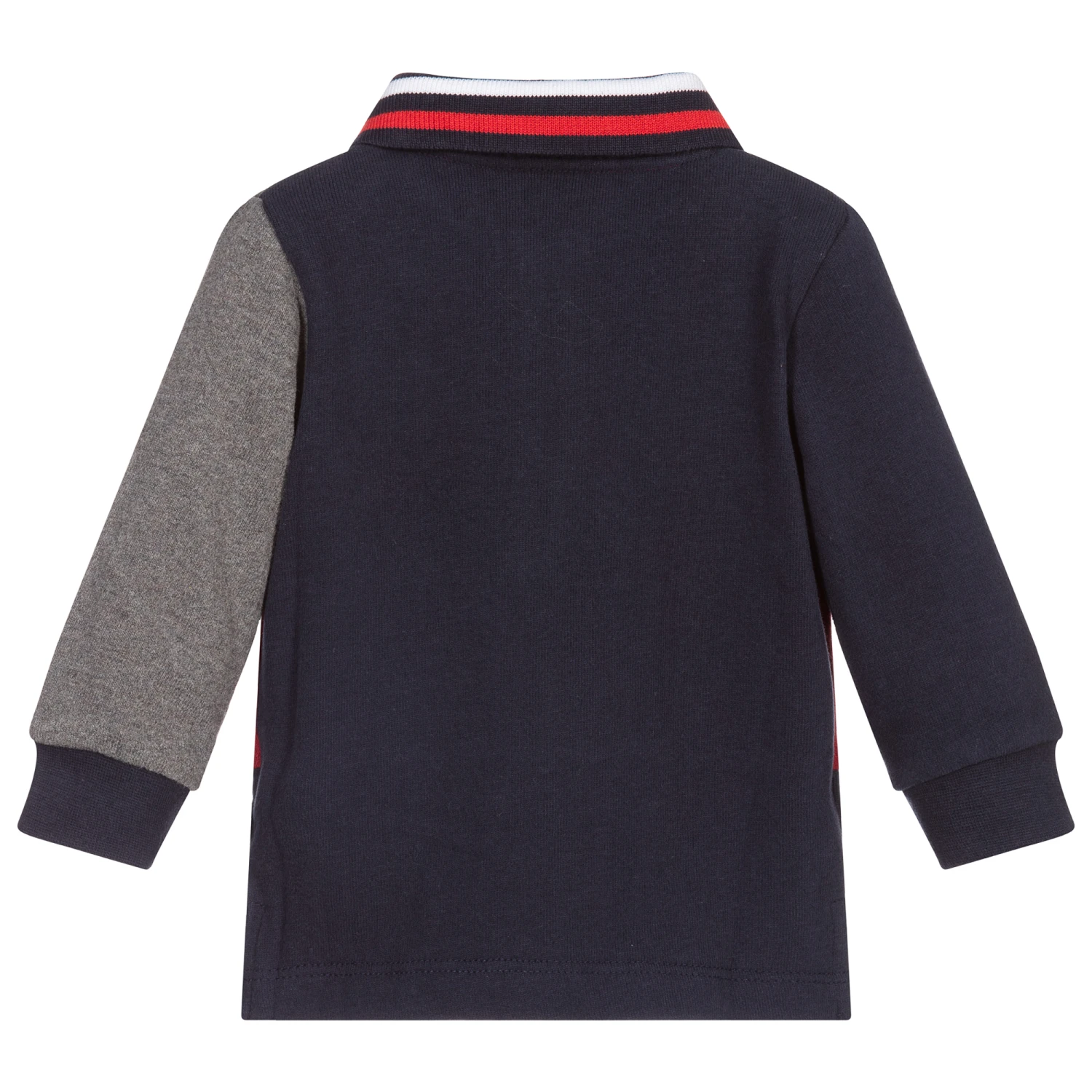 Colourblock polo shirt for boys by iDO Baby, in navy blue, grey and red. It is made in soft cotton jersey, with a ribbed collar and cuffs. It has a fun motif on the chest in red, yellow and blue.