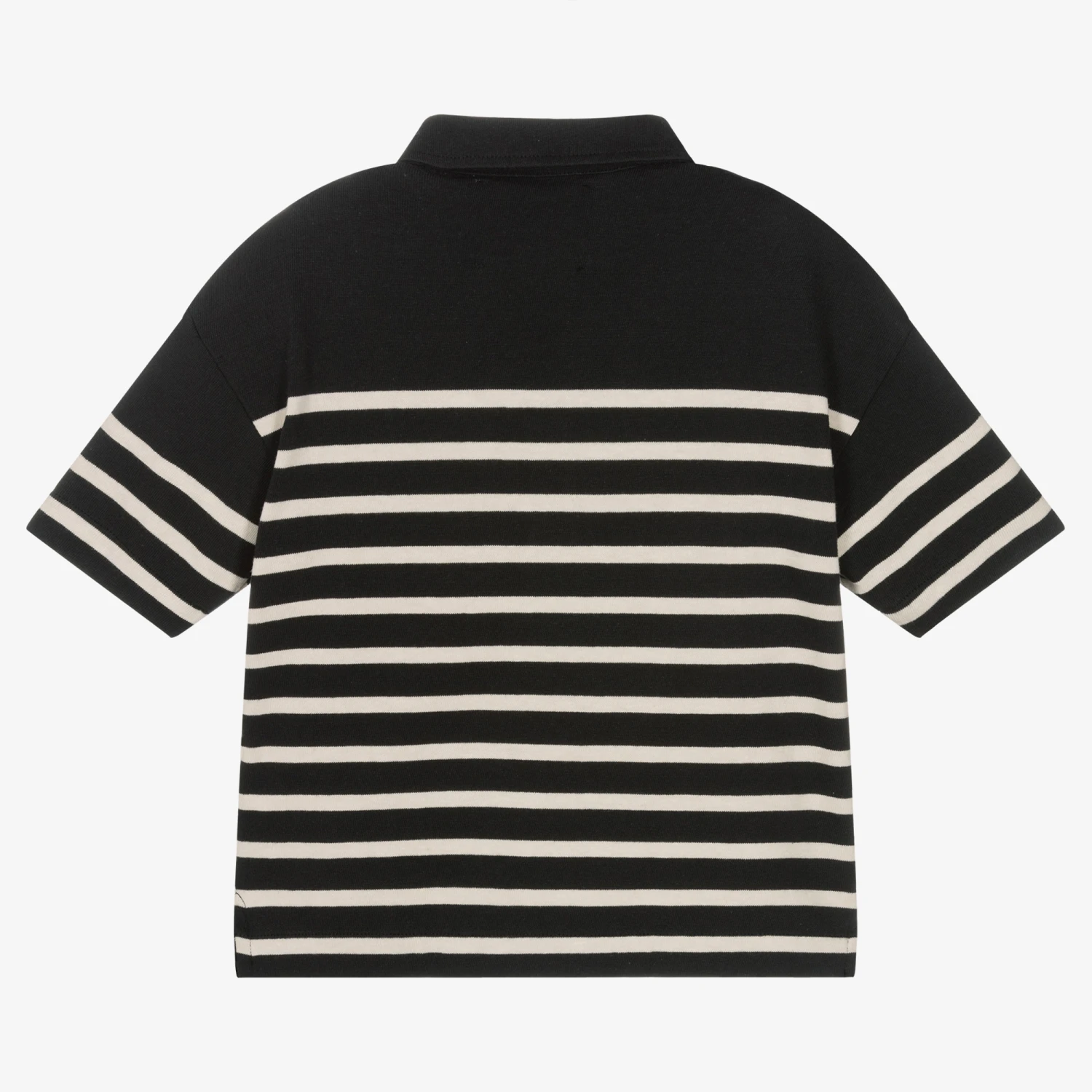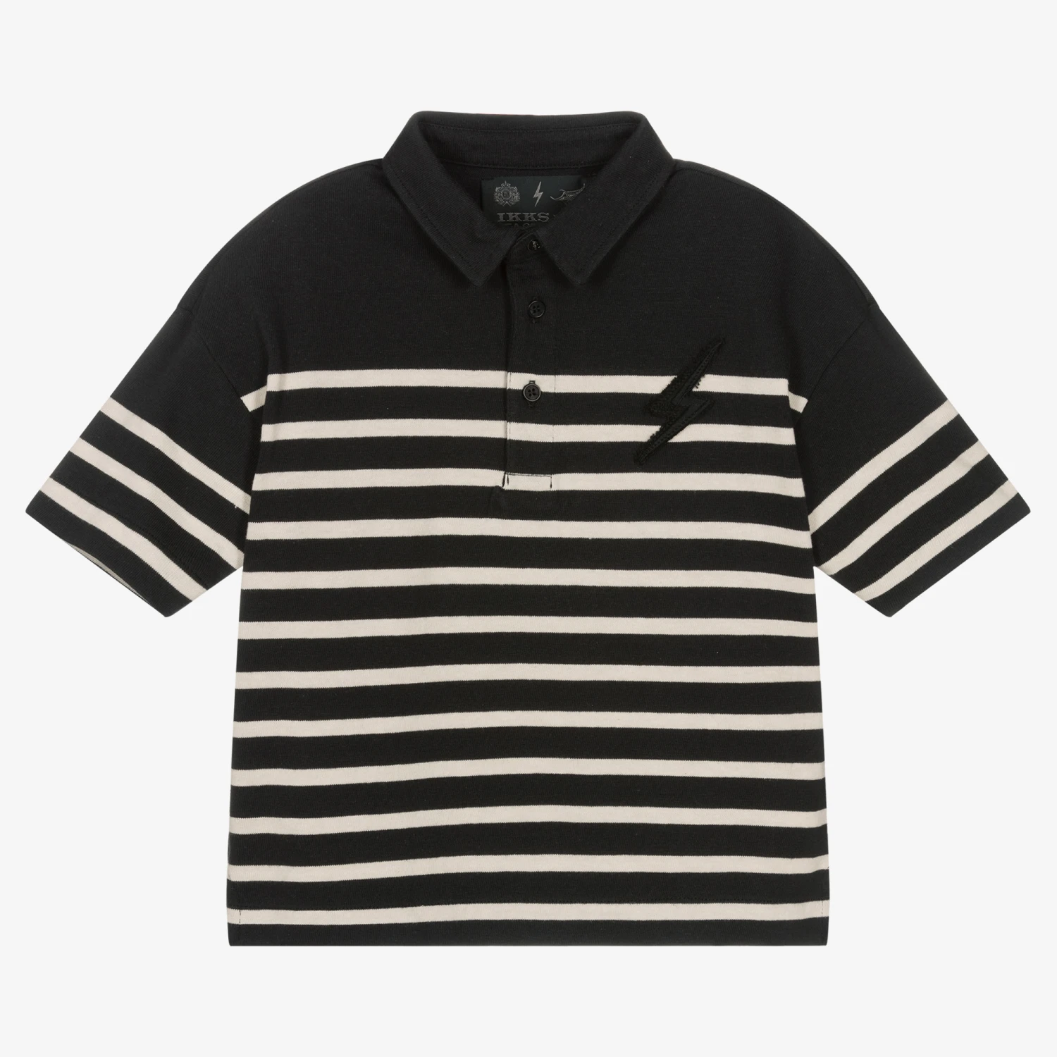 An ivory and black striped polo shirt for boys by IKKS, made in soft, stretchy and mid-weight cotton-mix jersey. In collaboration with French ocean conservationists The SeaCleaners, this short-sleeved top has a lightning bolt appliqué on the front with edgy frayed trims. It has a pointed collar and a front popper fastening with a cool skull detail.