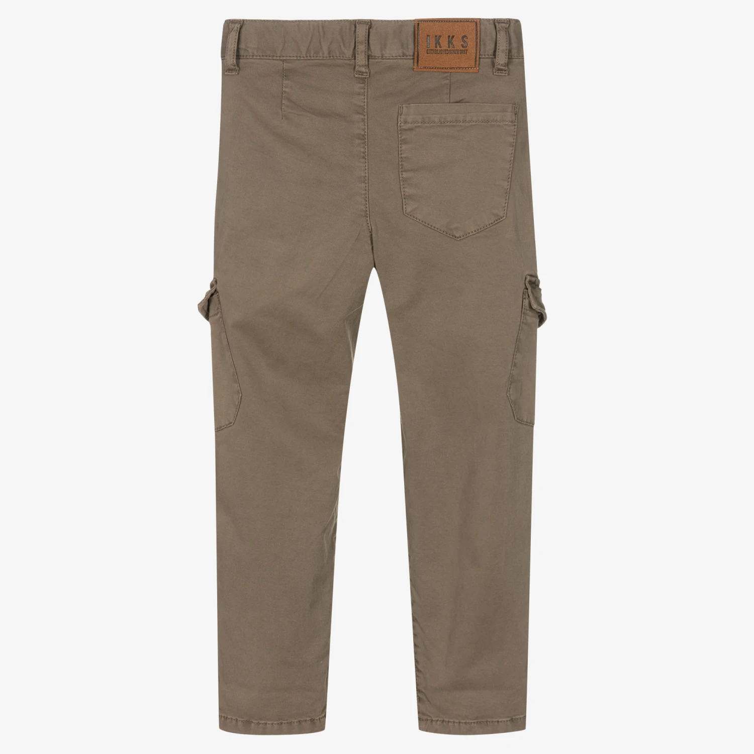 Khaki brown cargo trousers for boys from French label IKKS. They are woven in soft cotton twill, with slight stretch for all-day comfort. Cool and casual, they have utility pockets and a tapered fit towards the hem. The waist is adjustable for a great fit, and they fasten with hook and eye and zip fastenings on the front.
