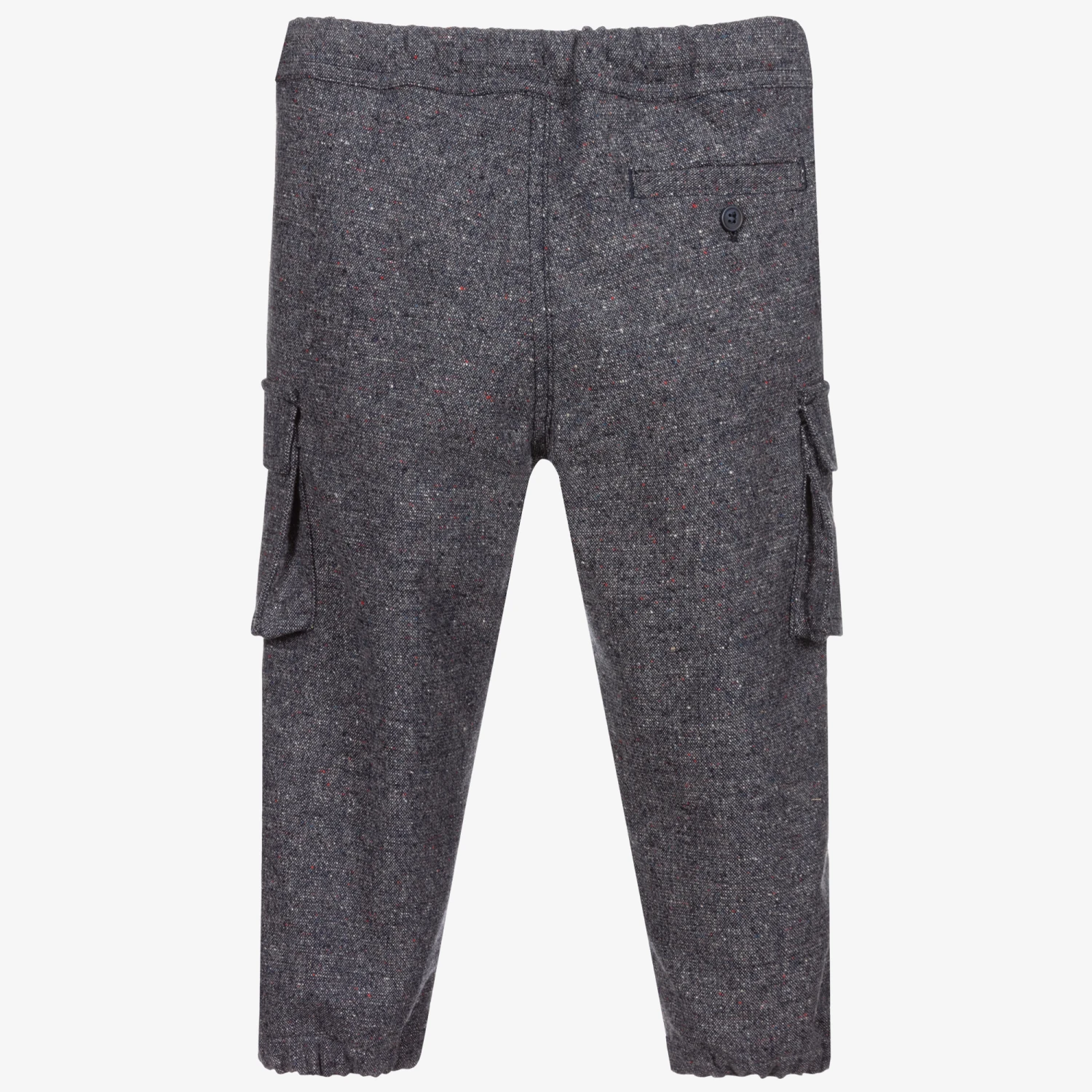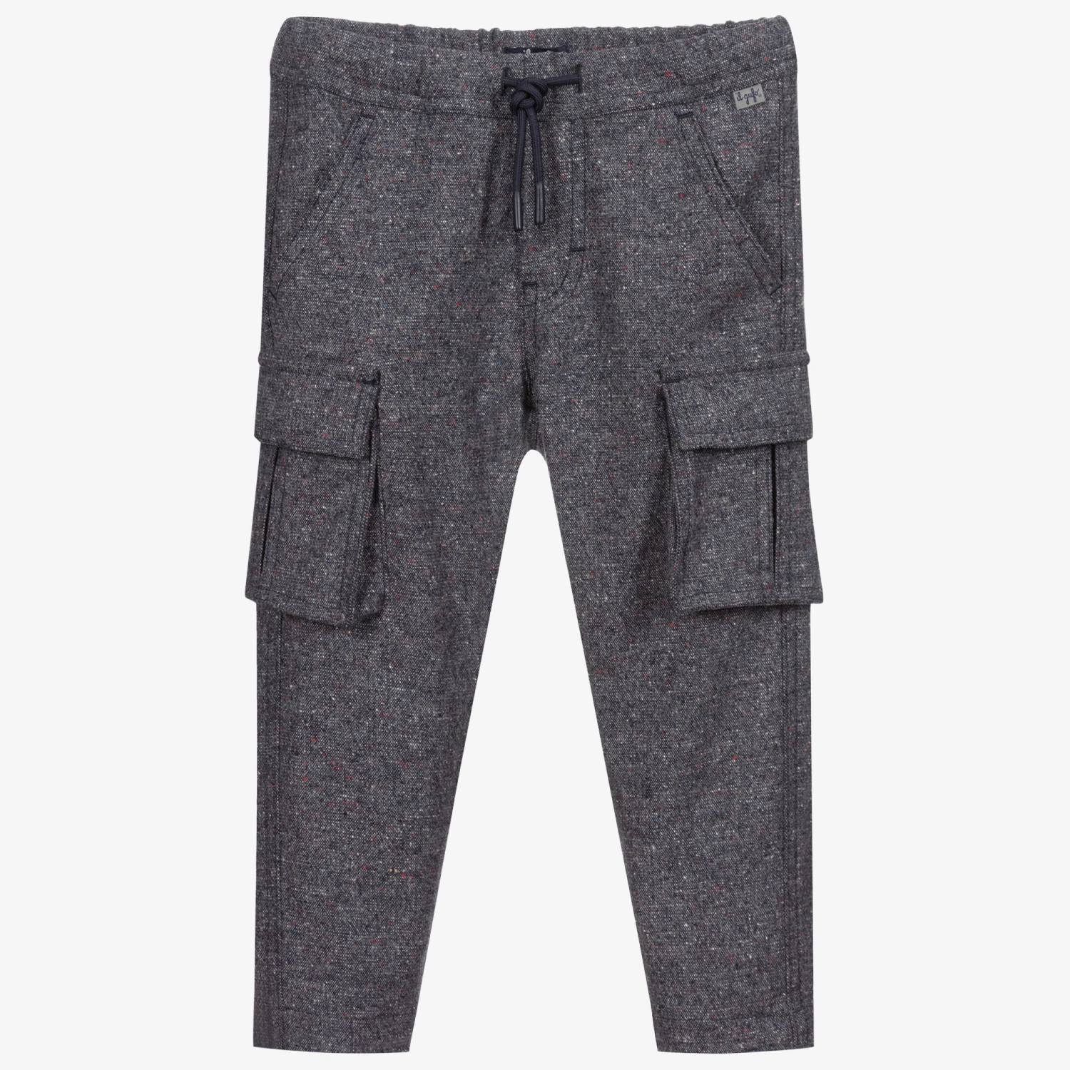 Boys navy blue cargo trousers from Italian luxury brand Il Gufo, with subtle red and white speckles in the weave. Made in a soft wool and silk blend, they have slanted front pockets and utility-style pockets on the legs. The cuffs are gently elasticated on the back and the elasticated waist has an adjustable drawstring.