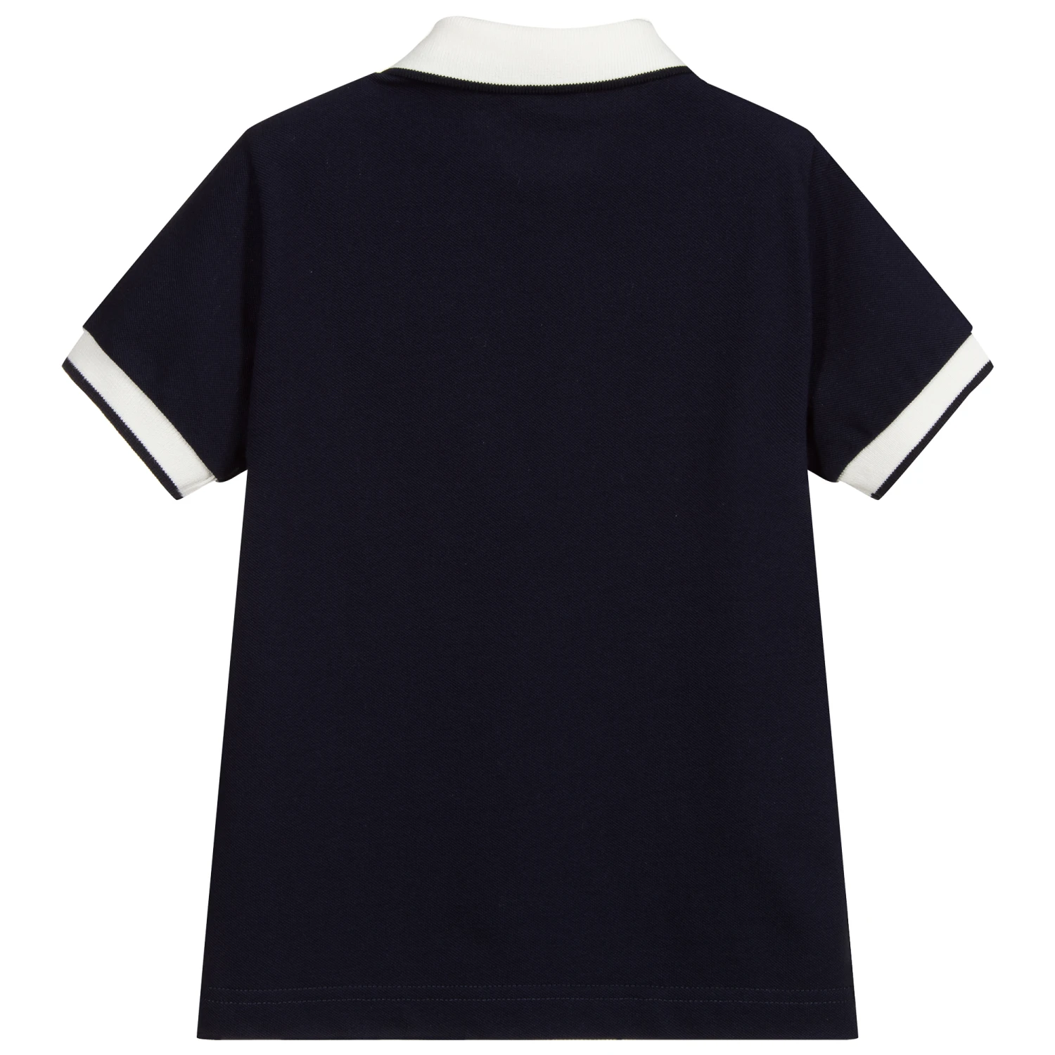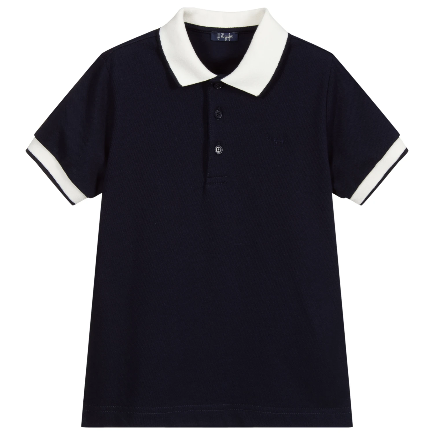 Navy blue polo shirt for boys by Il Gufo, made in soft cotton piqué. It has ivory trims on the collar and cuffs.