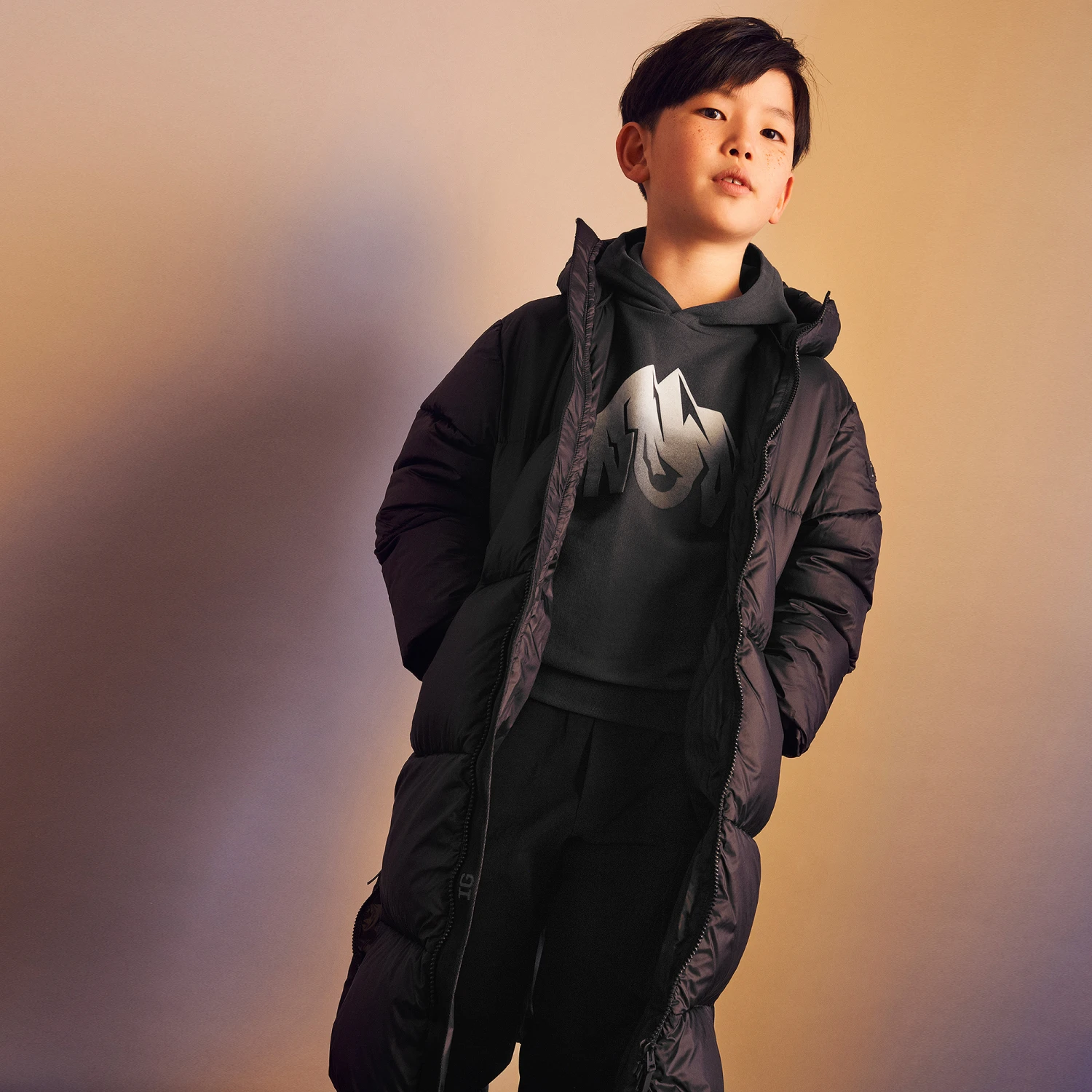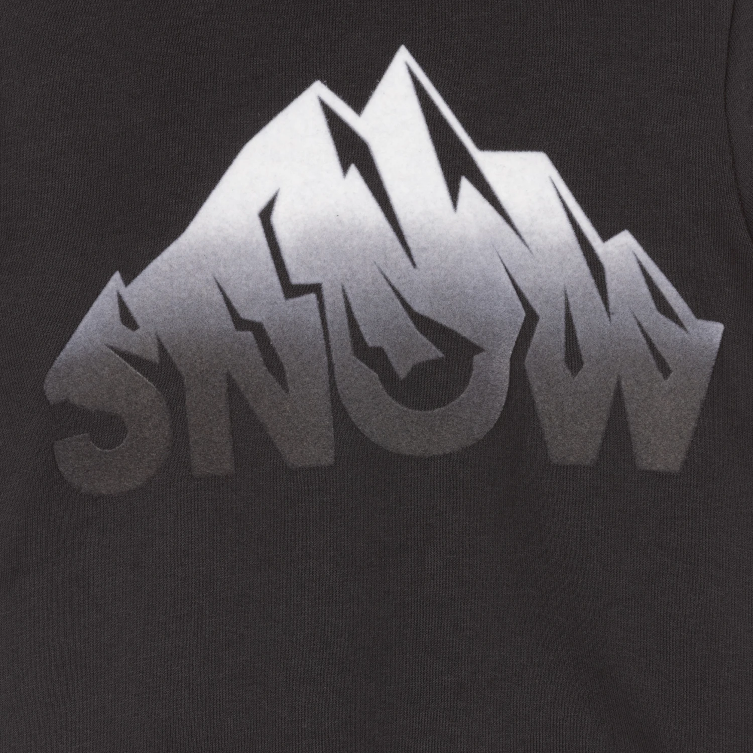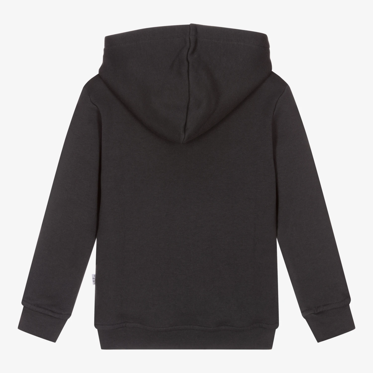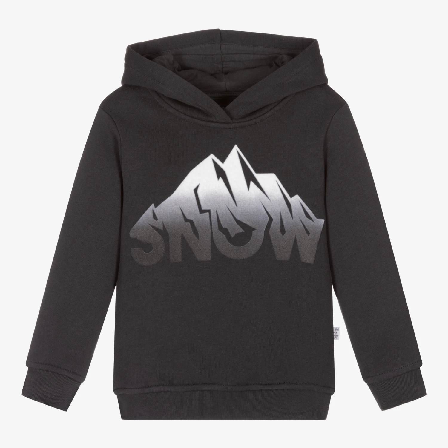 Dark grey hooded sweatshirt for boys by luxury brand Il Gufo. It is made in soft cotton jersey and has a warm fleecy inside. There is felted ‘Snow’ motif on the front in contrasting shades of grey.