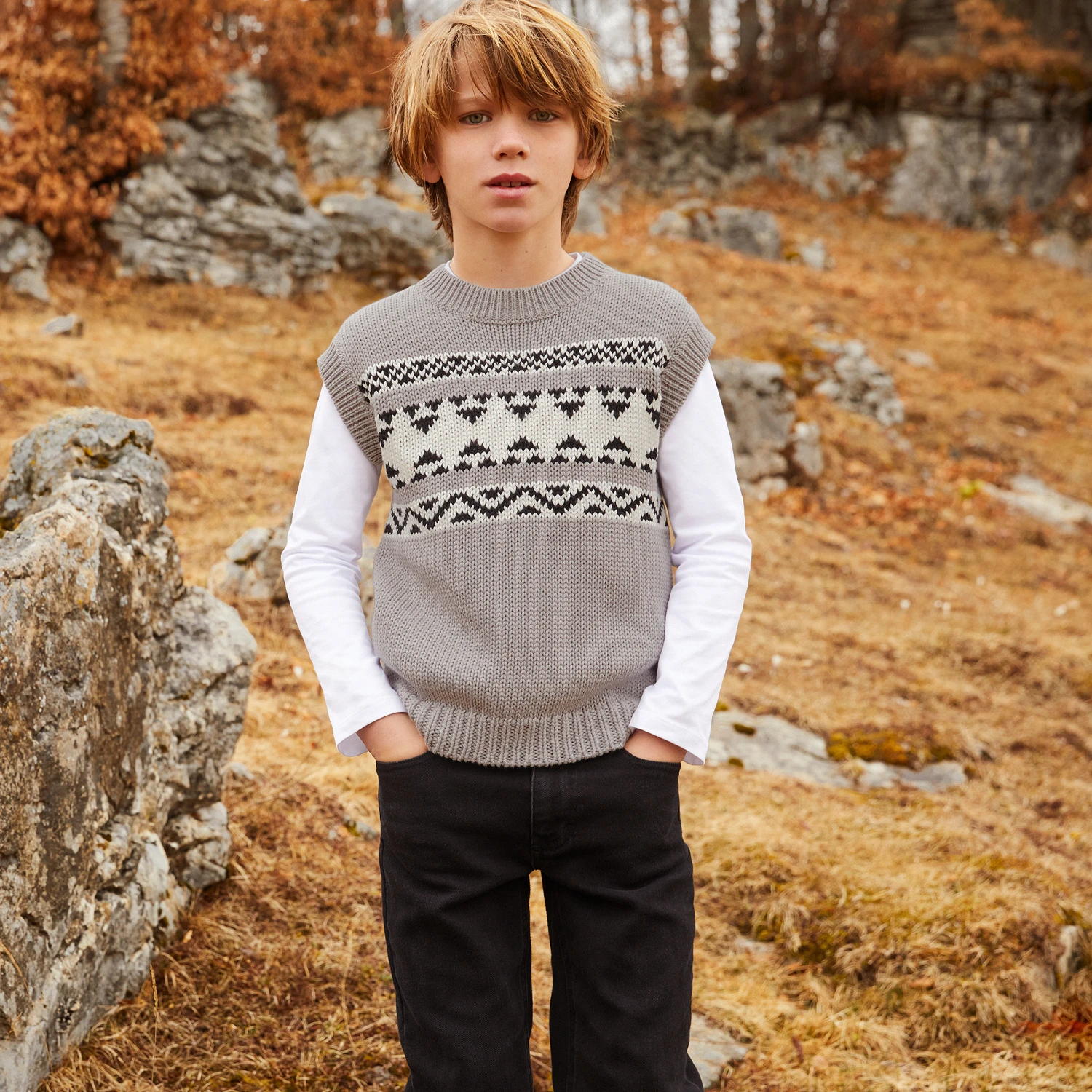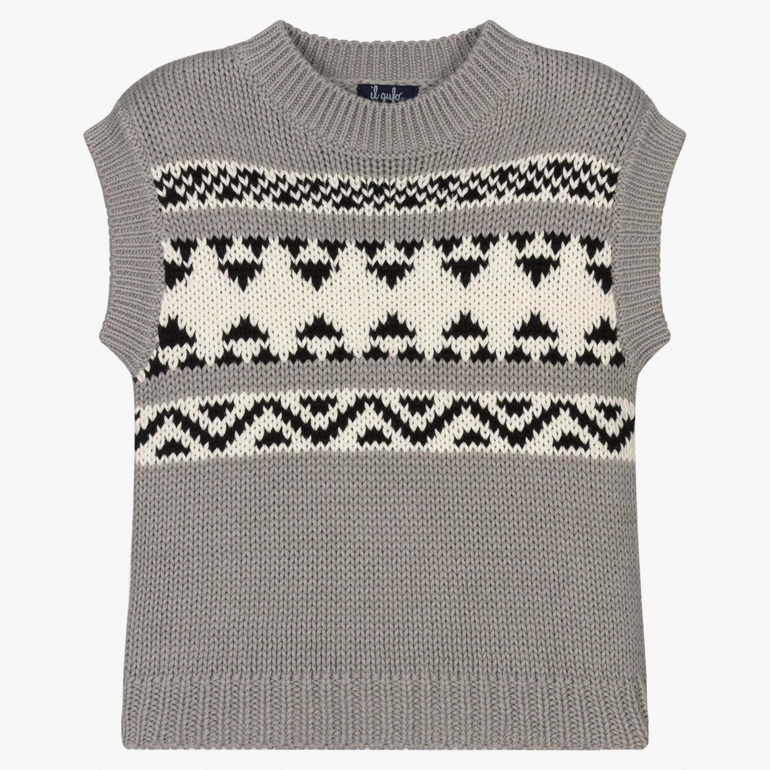 Grey slipover for boys by luxury Italian brand Il Gufo, with bands of geometric patterns in ivory and black. Knitted in mid-weight organic cotton with ribbed trims, it adds an extra layer of warmth to an outfit.