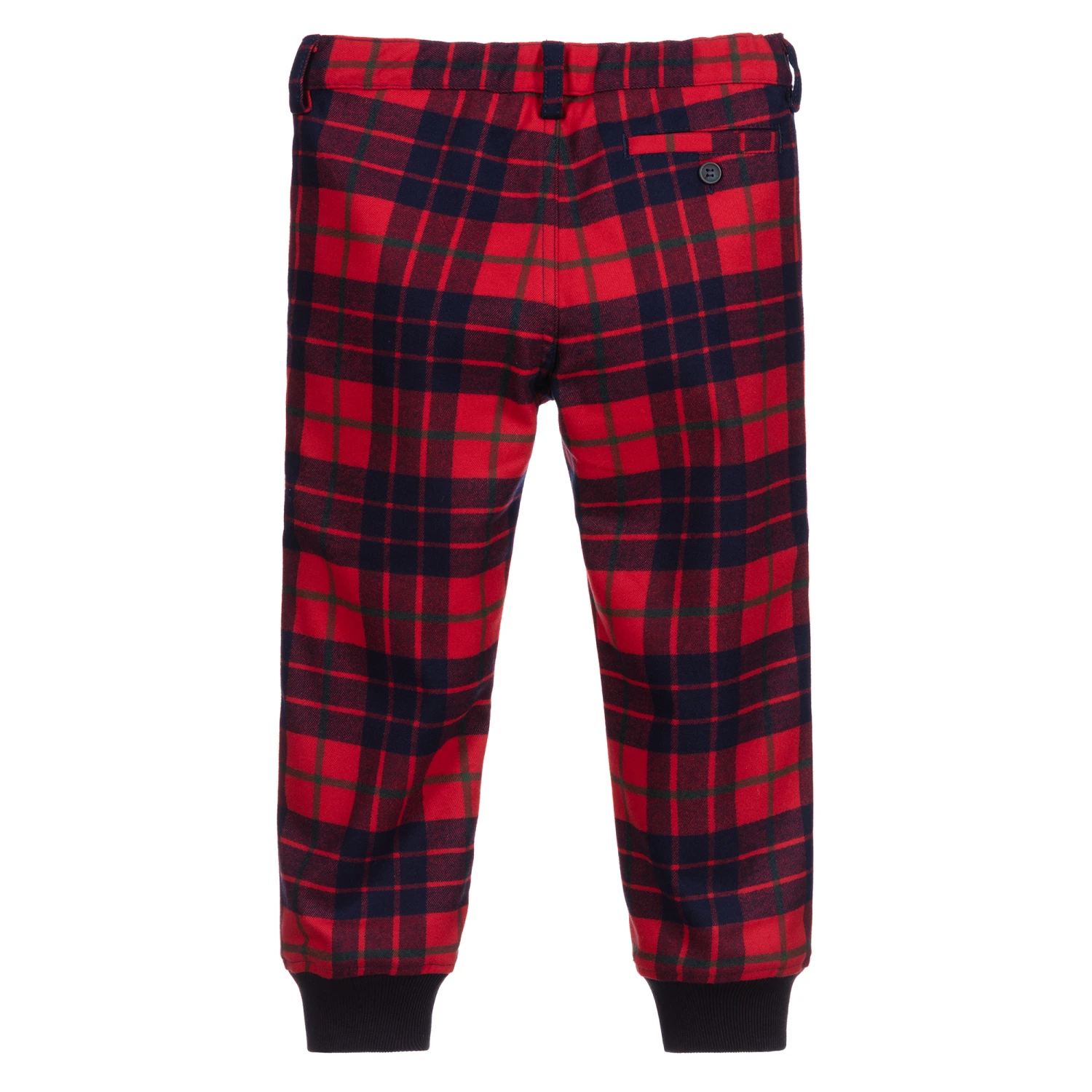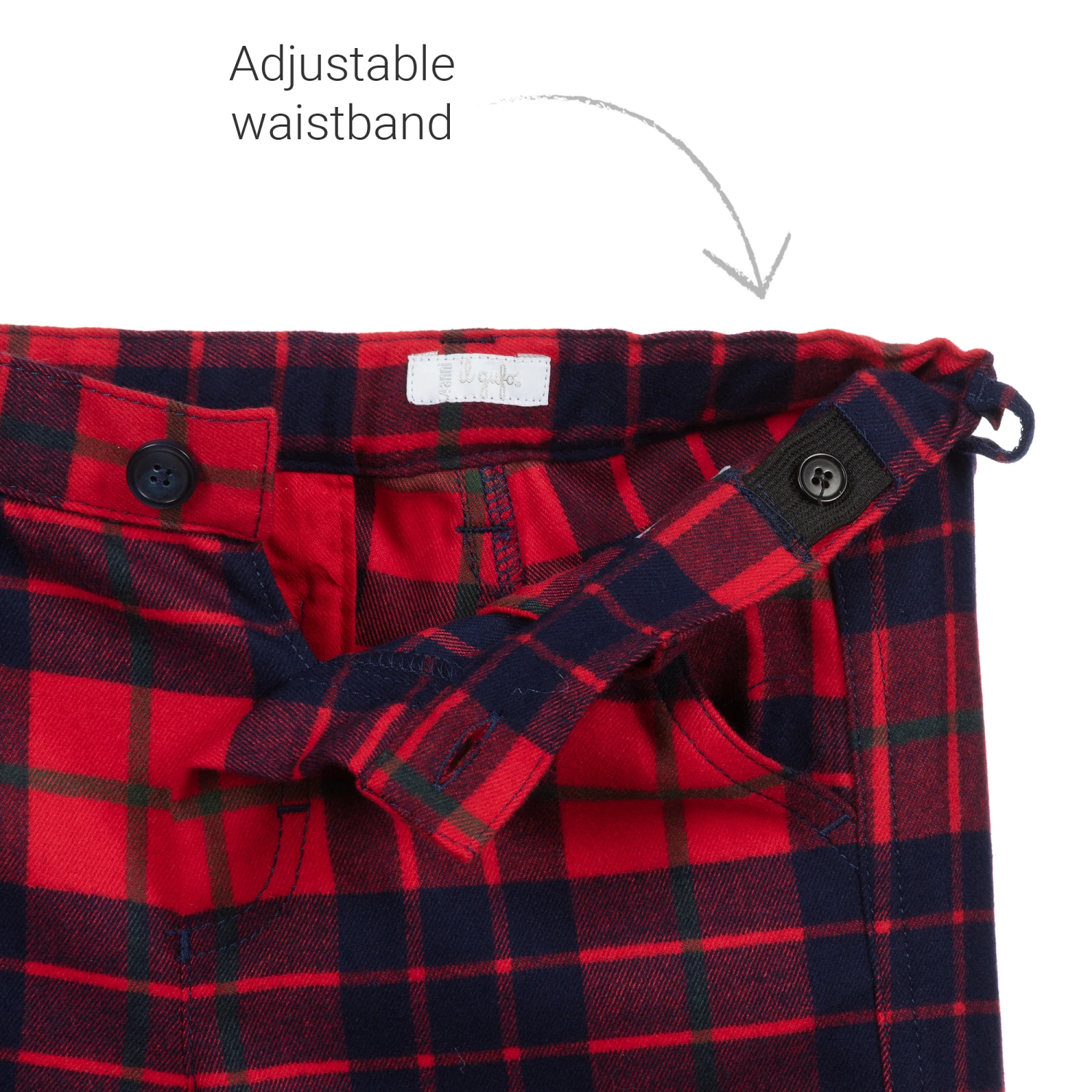 Red and navy blue check trousers for younger boys by Il Gufo, made in soft, brushed flannel. They have an adjustable waistband and dark navy blue ribbed cuffs, with a button to fasten.