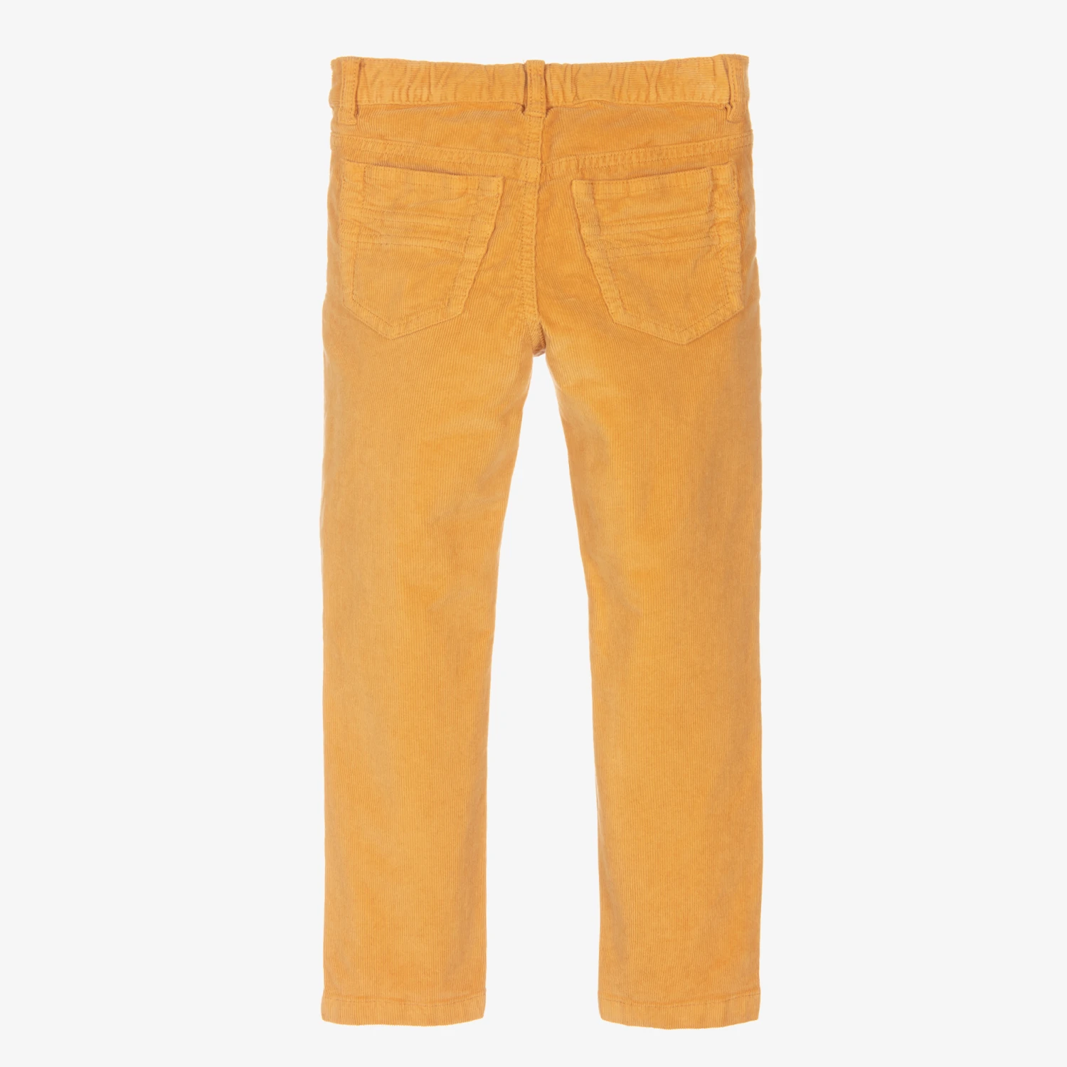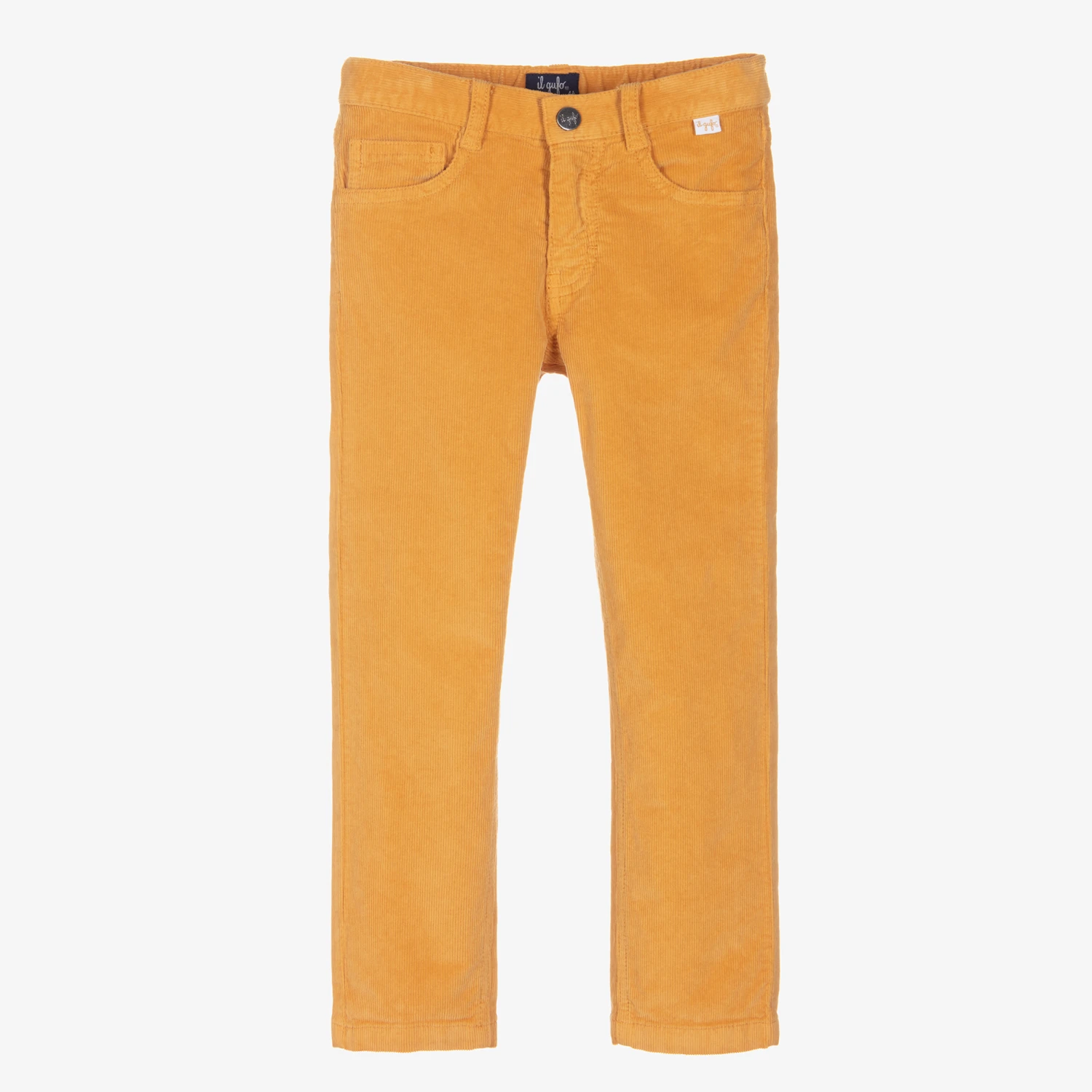 Classic yellow needlecord trousers for boys by Italian designer Il Gufo. With traditional five-pocket jeans styling, they fasten with a shiny silver logo popper and zip, and have a fabric logo tab above one pocket. Made in comfortable cotton, they have a useful adjustable waistband for a good fit.