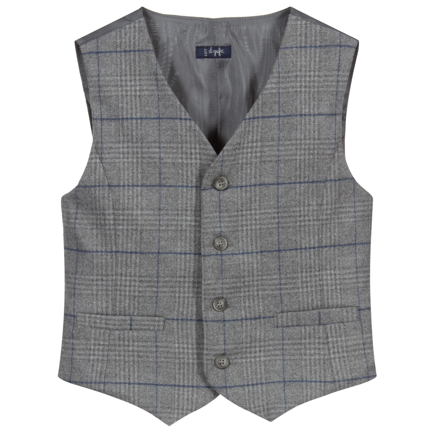 Grey check waistcoat for boys by Il Gufo, made in a super soft, mid-weight fabric with a silky, lightweight lining and back. It has a grey and navy blue check pattern and two faux pockets.