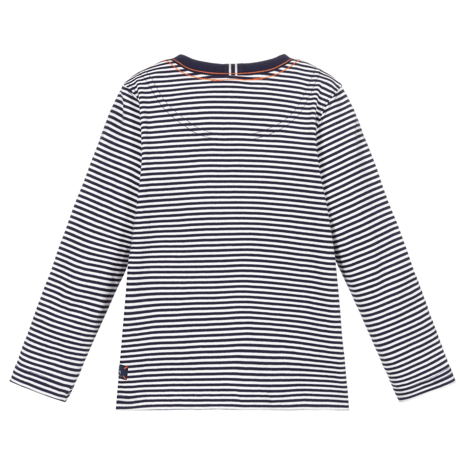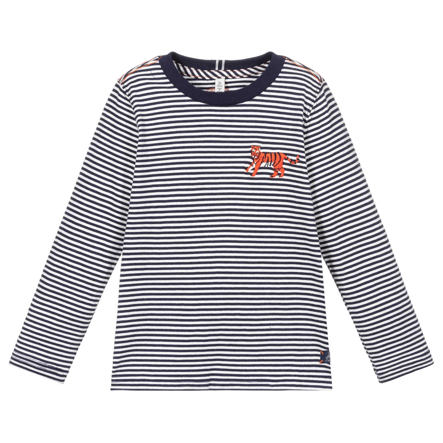 Navy blue and white striped top for boys by Joules, made in soft and stretchy cotton jersey. It has a cute orange and black embroidered tiger on the chest.