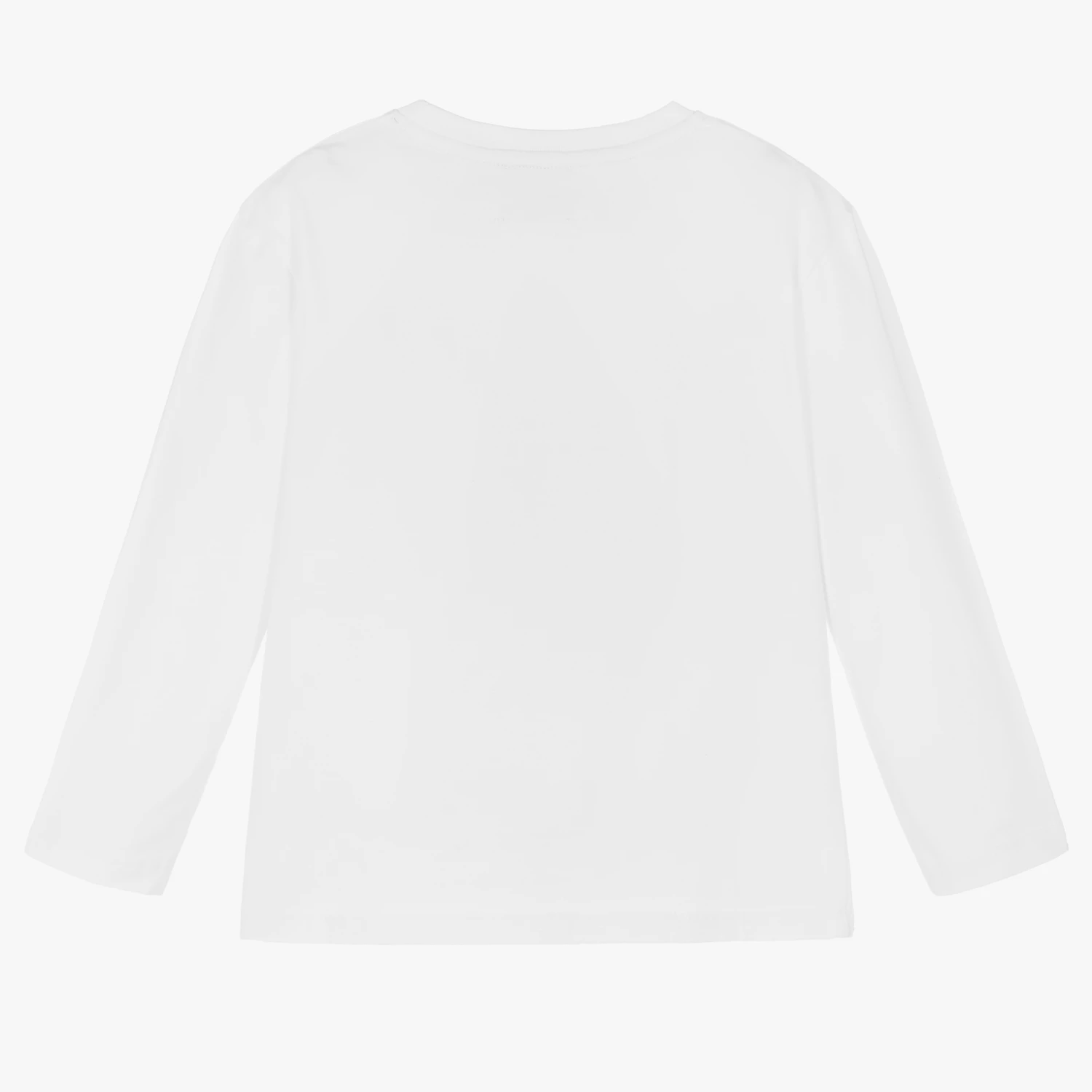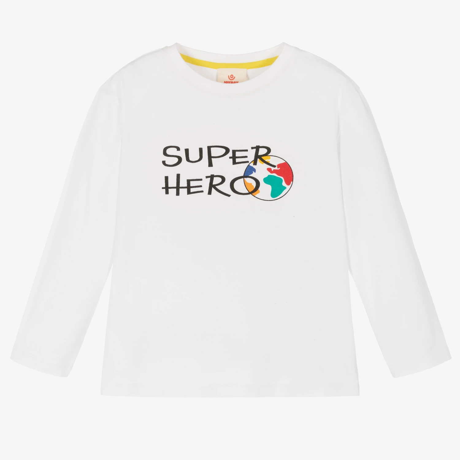 Exclusive to Childrensalon, a white cotton top for boys by Joyday. It has ‘Super Hero’ and a colourful World printed on the front. Easy to wear, it is made in comfortable jersey.