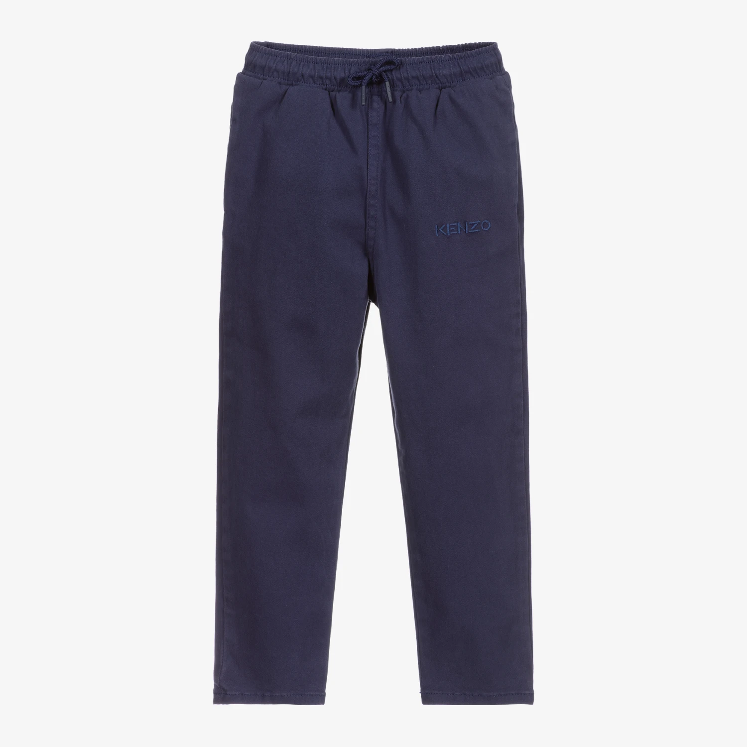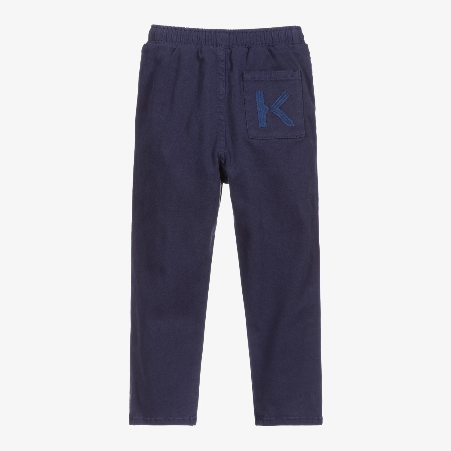 Boys navy blue for boy by KENZO KIDS, made in soft cotton twill. The brand’s name is embroidered on the front in blue and there is an X logo on the back pocket. There are two front pockets and the waistband is gently elasticated with a drawstring.