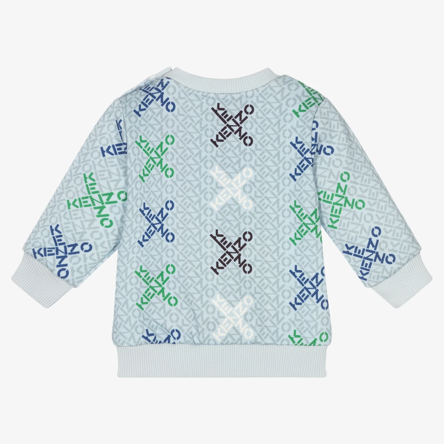 Pale blue sweatshirt for little boys, by KENZO KIDS. Made in soft cotton jersey, it has an all over grey logo pattern, with the brand’s Small X logo over the top in shades of blue, black, green and white.
