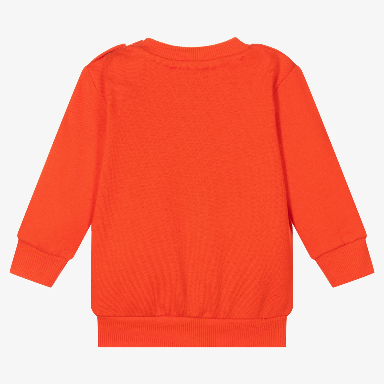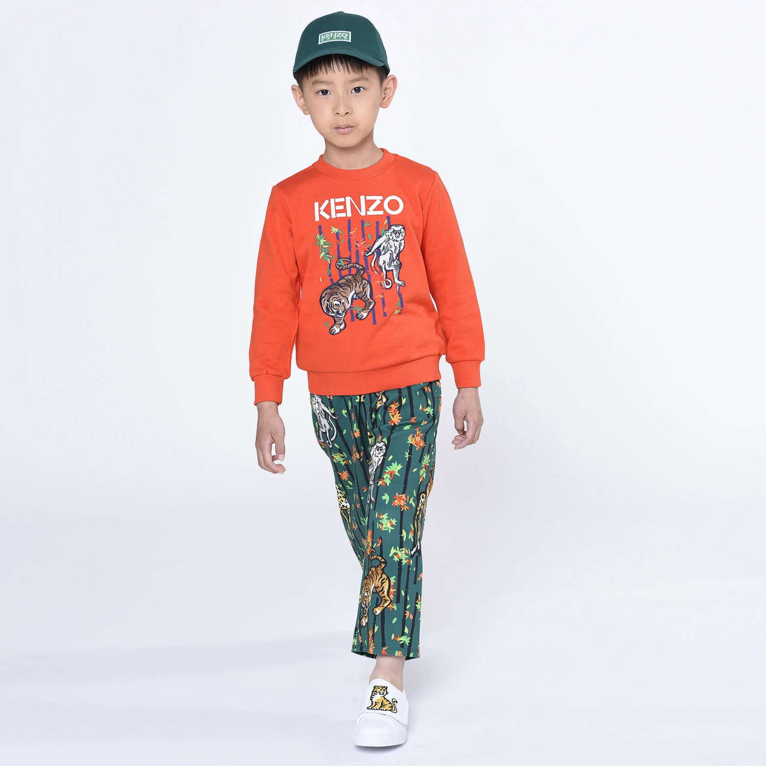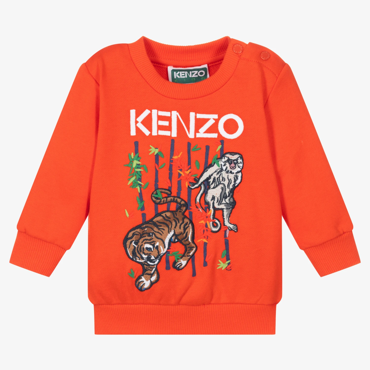 Little boys red-orange sweatshirt from KENZO KIDS, made in easy-wearing mid-weight cotton jersey. Great for adding a sense of fun to your little one’s wardrobe, it has cute jungle embroidery on the front, with a tiger and monkey. It is finished with logo poppers on one shoulder and large white logo lettering in a final brand flourish.