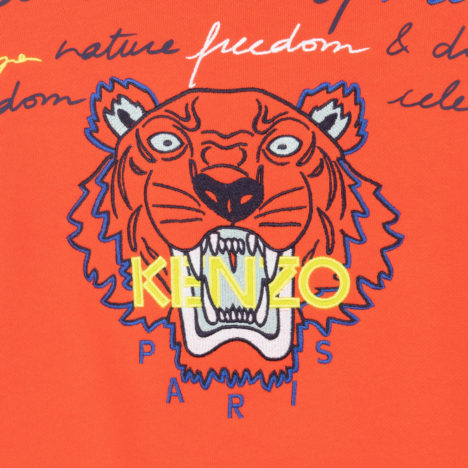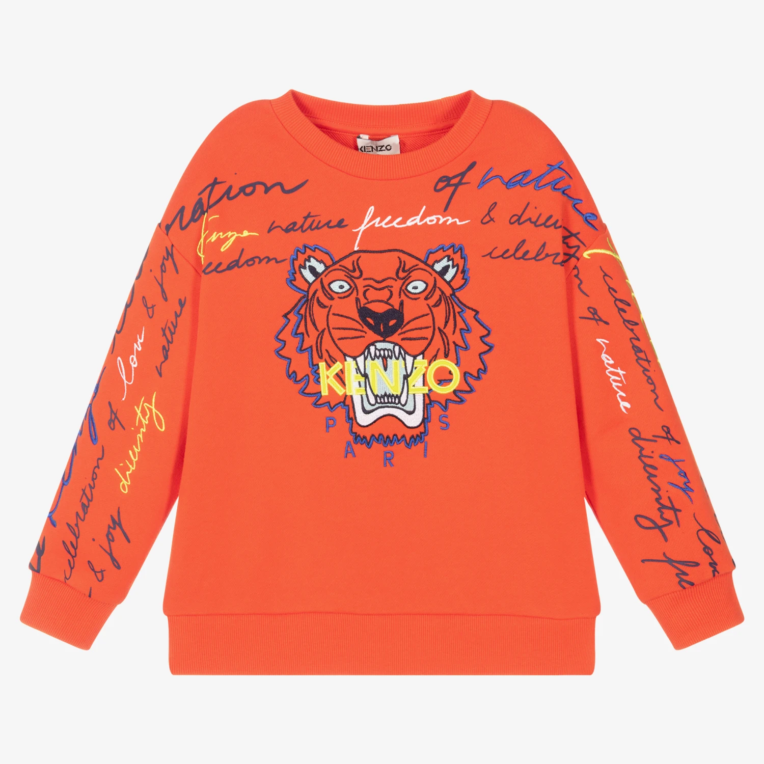 Orange cotton sweatshirt for boys by luxury brand KENZO KIDS. Made in stretchy, mid-weight jersey, it has the designer’s iconic Tiger logo embroidery on the front, accompanied by printed and embroidered script lettering across the sleeves in shades of blue, white and yellow.