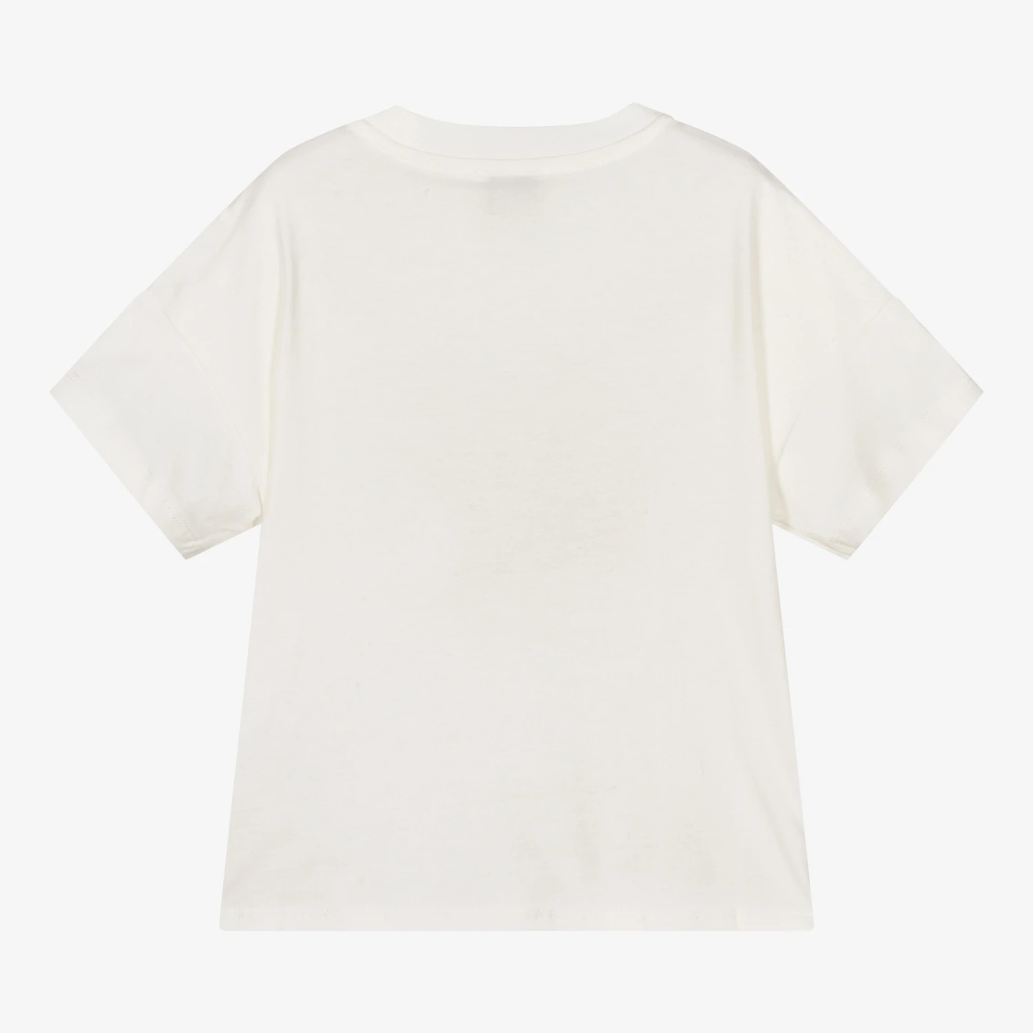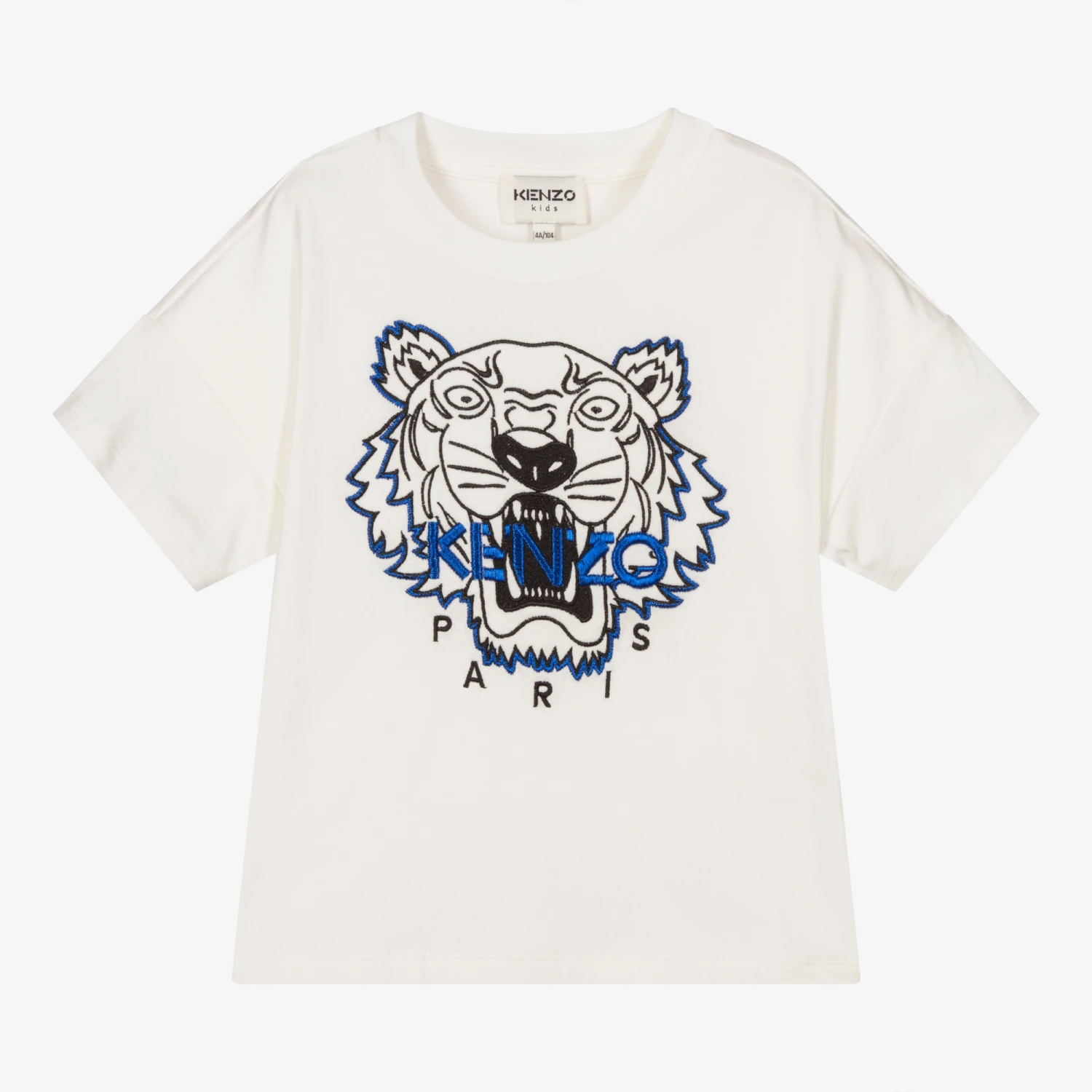 Boys ivory T-shirt by KENZO KIDS, made in soft organic cotton jersey. It has the designer’s iconic Tiger logo embroidered in black and electric blue.