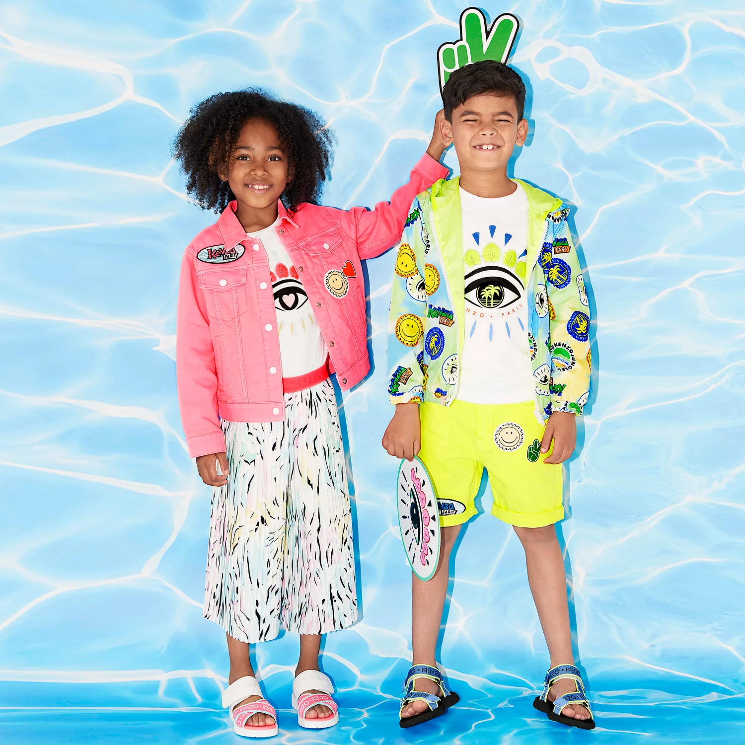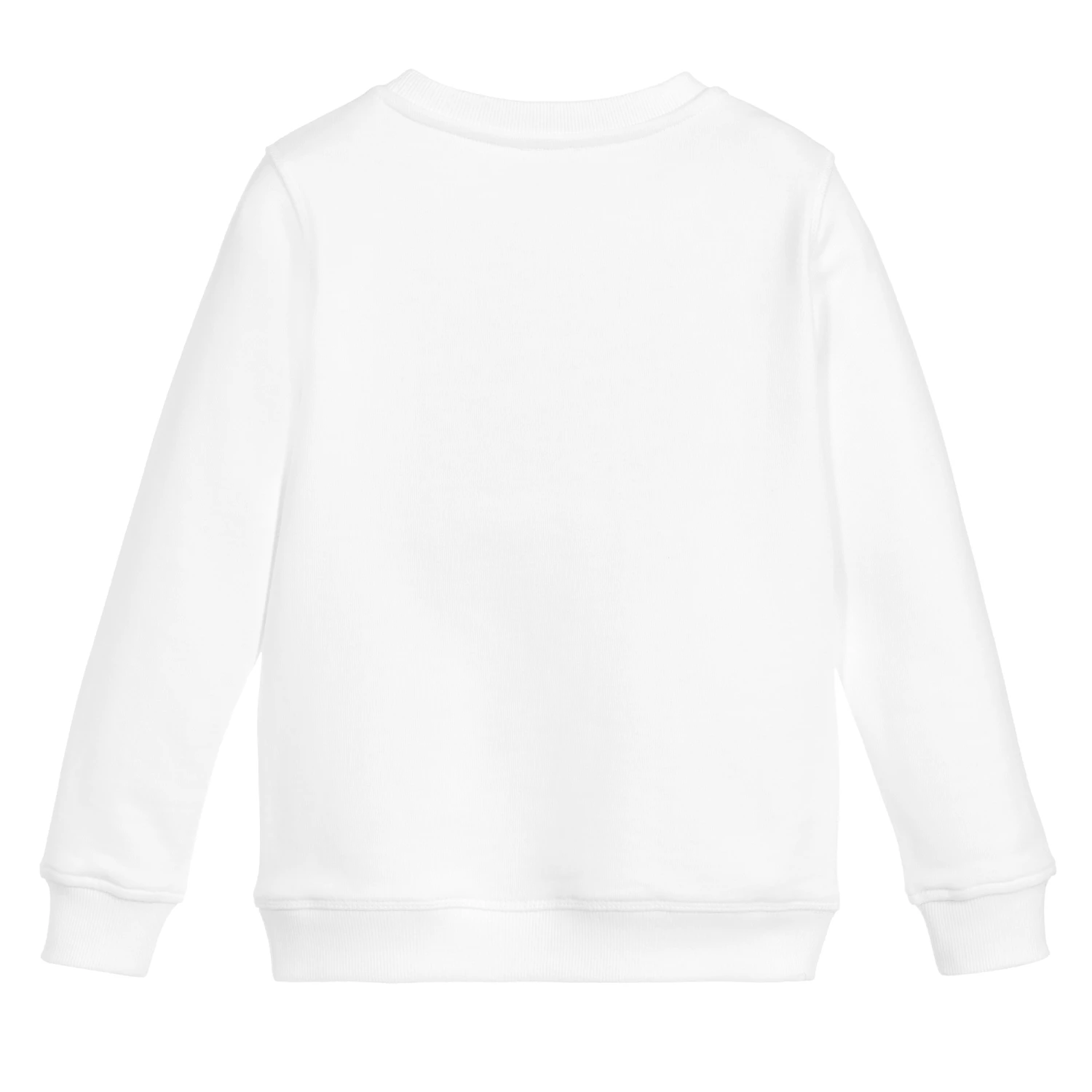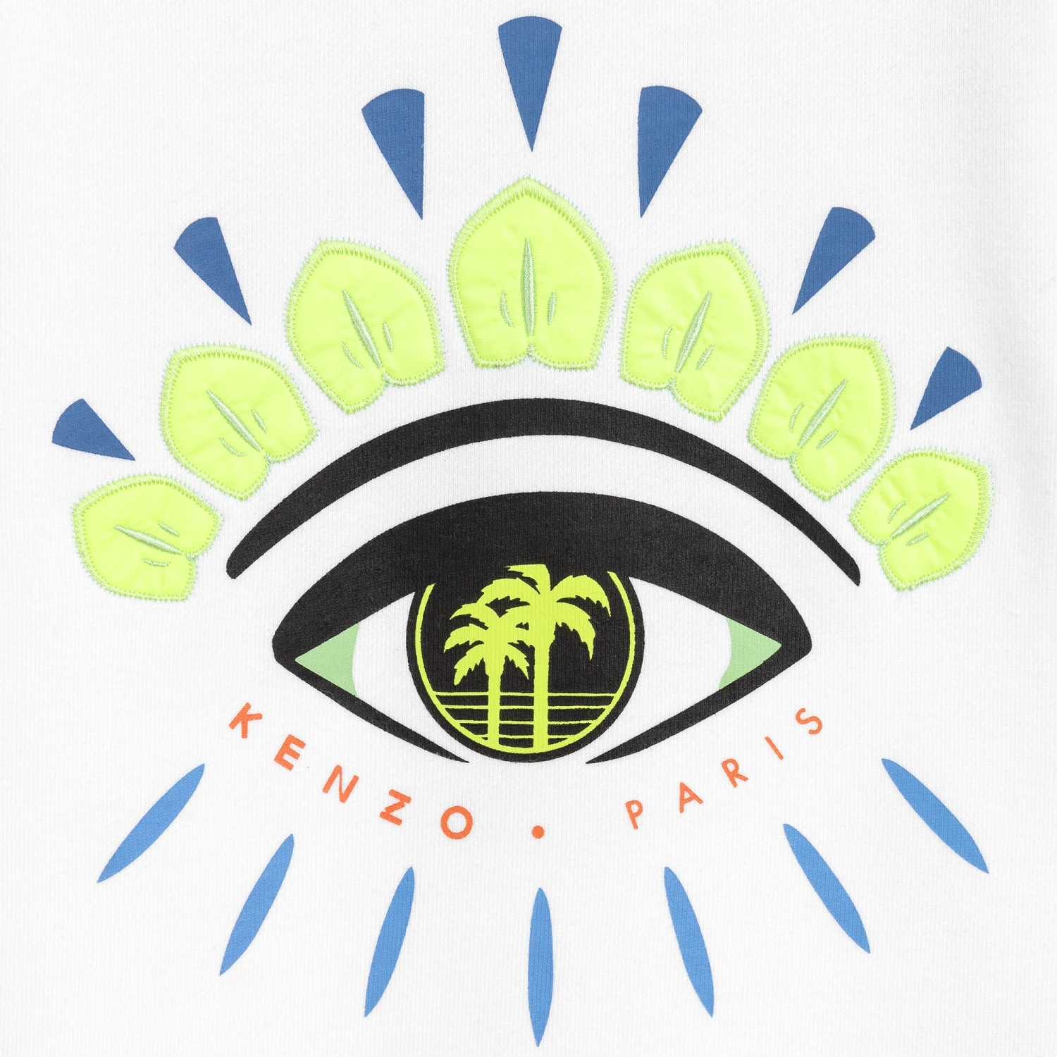 Boys white cotton sweatshirt by Kenzo Kids, with the brand’s signature Eye print in blue and neon yellow.