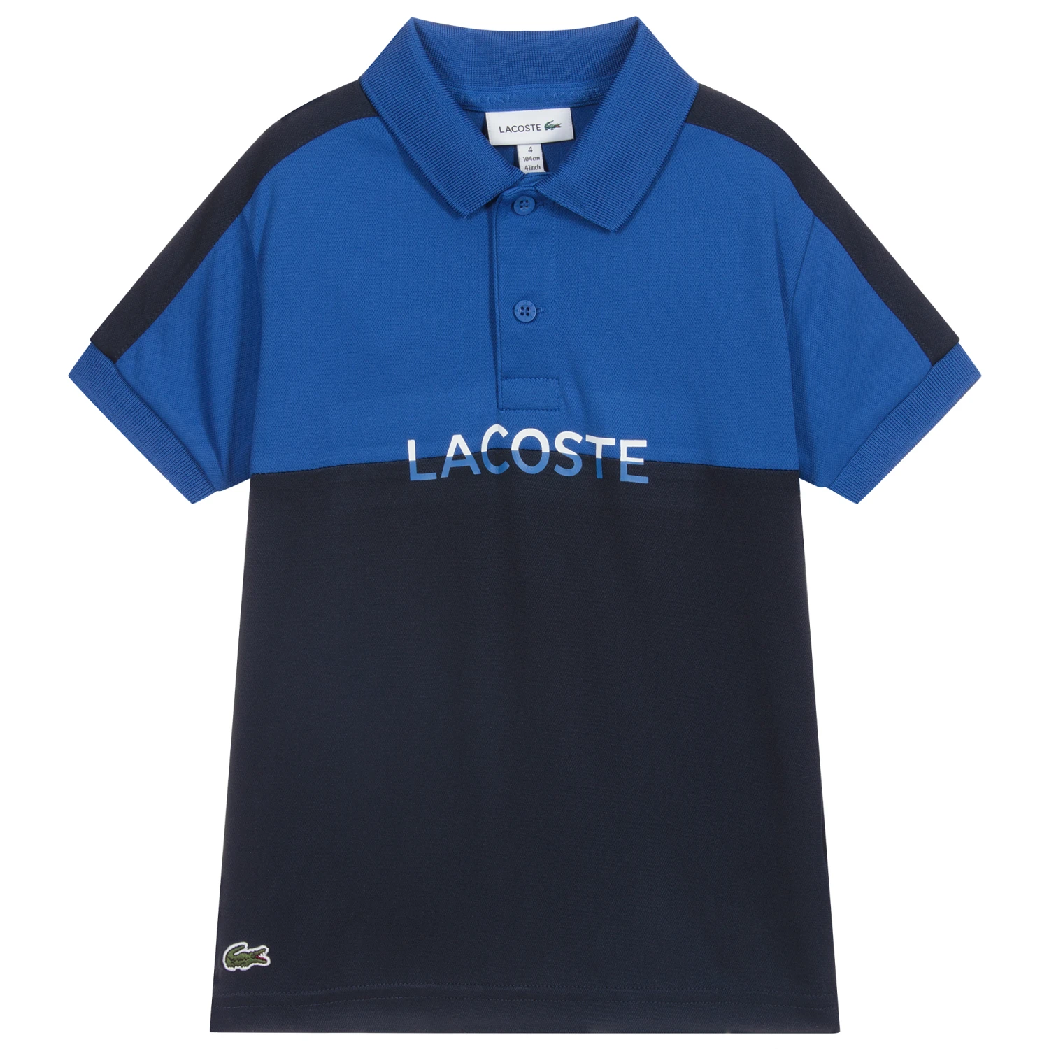 Boys royal blue and navy blue sports polo shirt by Lacoste, with a bright blue and white logo print across the chest. Made from breathable, ultra dry piqué, this casual top has a royal blue ribbed collar and the brand’s signature green crocodile logo embroidered on the hem.