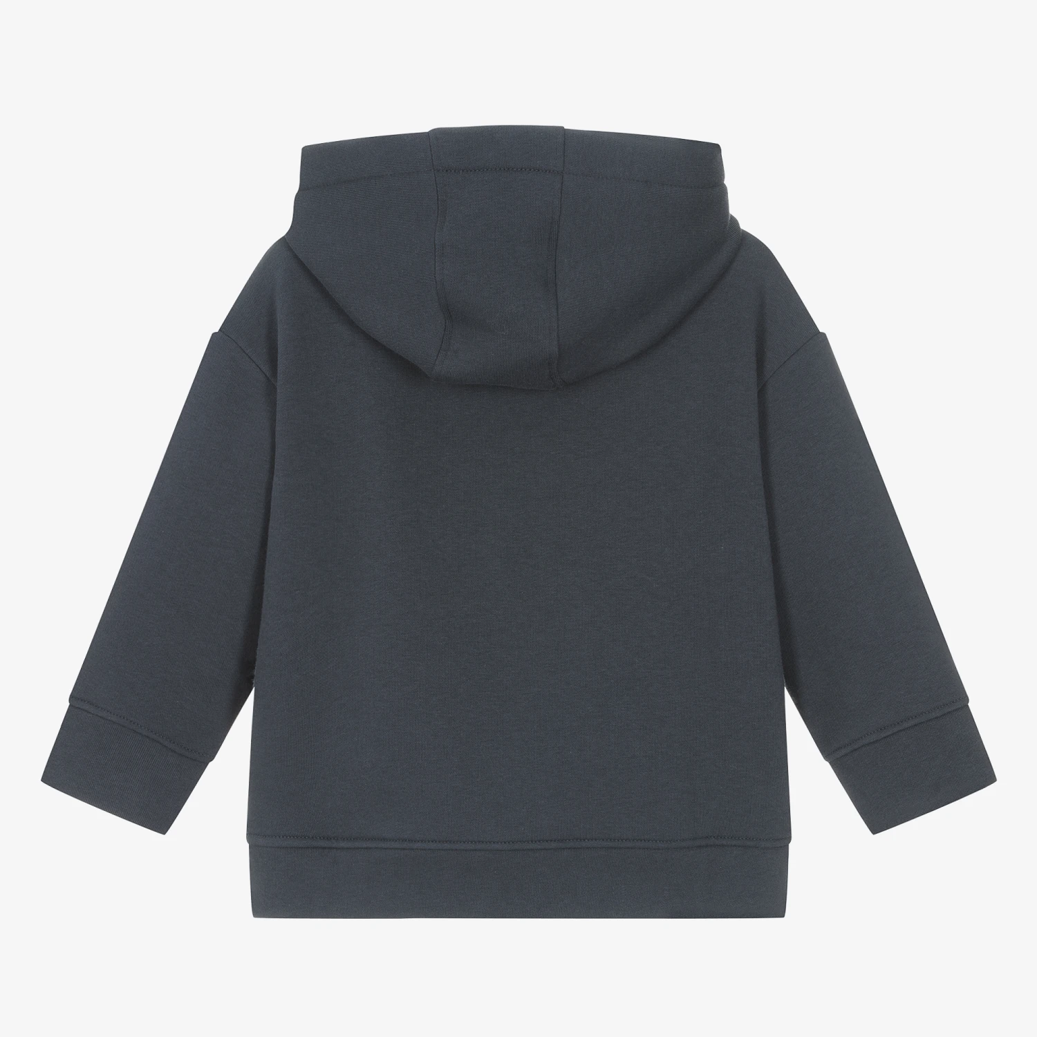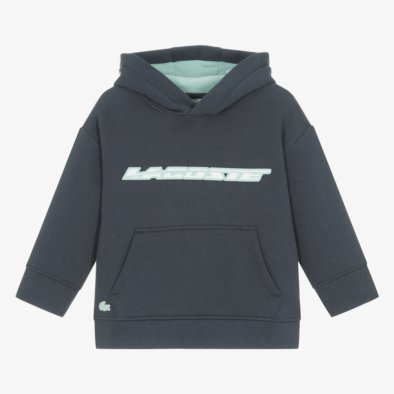 Navy blue cotton-blend jersey hoodie for boys by Lacoste, with a warm fleecy inside. It has a sporty pouch pocket on the front, with a pale green and white logo print across the chest. The brand’s rubberised crocodile logo is near the hem in matching pale green.