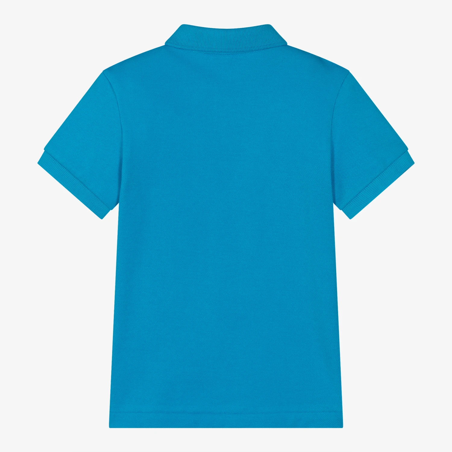 Blue polo shirt for boys by Lacoste, made in soft and stretchy cotton piqué, with the brand’s classic crocodile logo on the chest. It has a ribbed collar and cuffs, with button fastenings on the front.